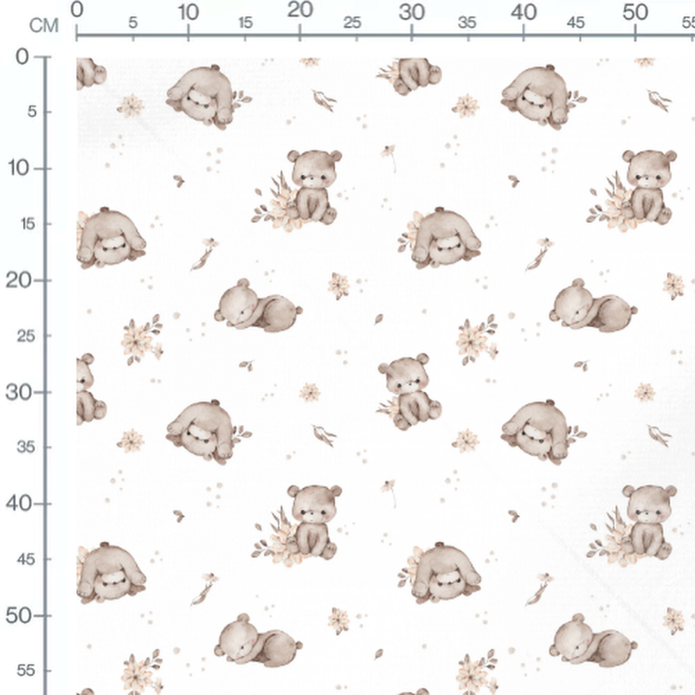 Les oursons sont dessinés dans des positions variées. Les fleurs et feuilles ajoutent une touche délicate au motif.Les tissus