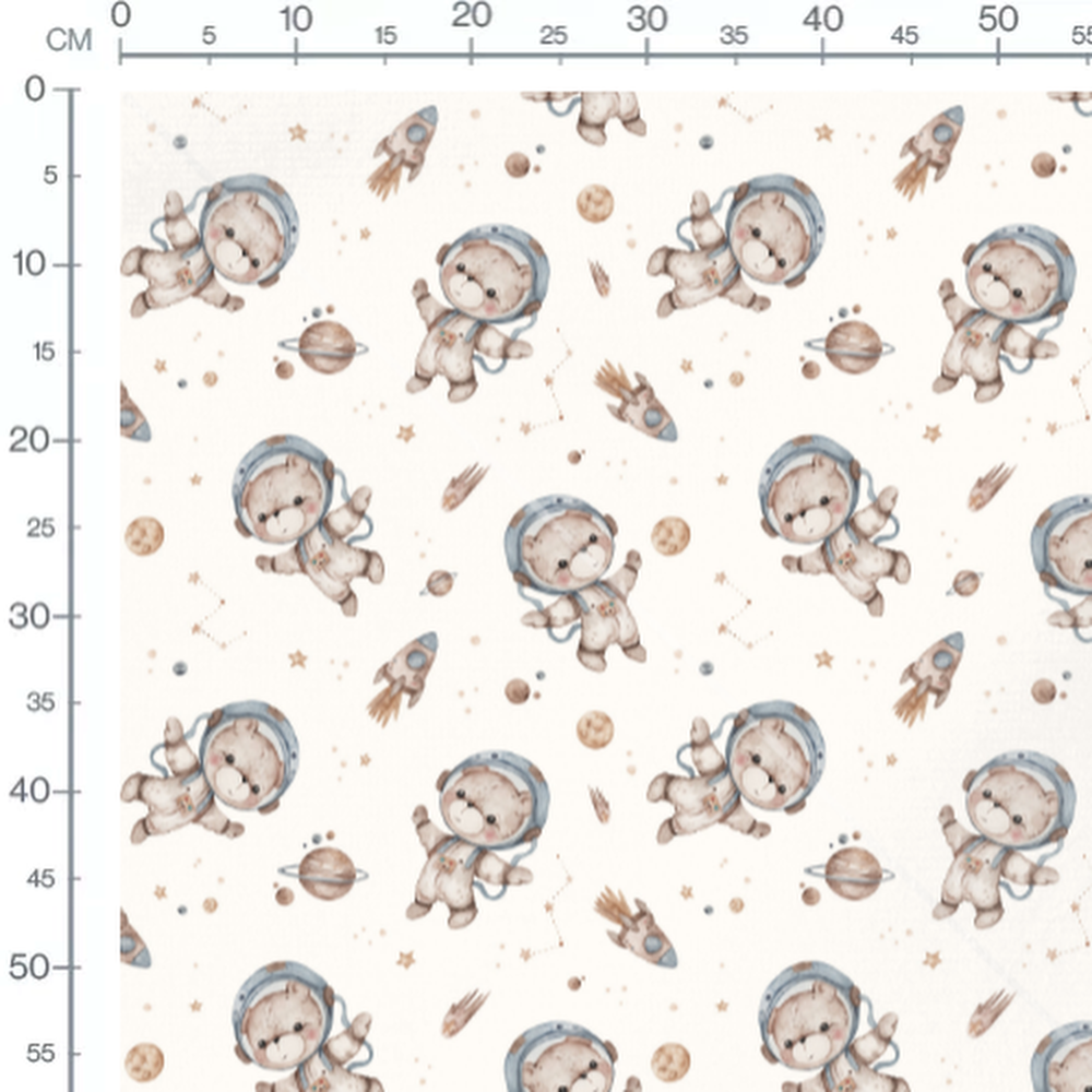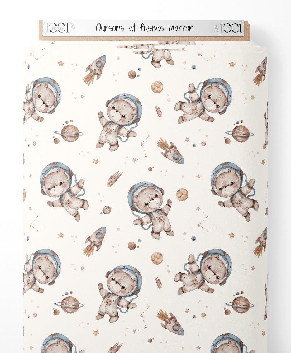 Les oursons portent des combinaisons spatiales avec des détails bleus. Des planètes avec des anneaux et des étoiles complètent le motif. Des fusées marron clair ajoutent une touche d'aventure spatiale.Les tissus