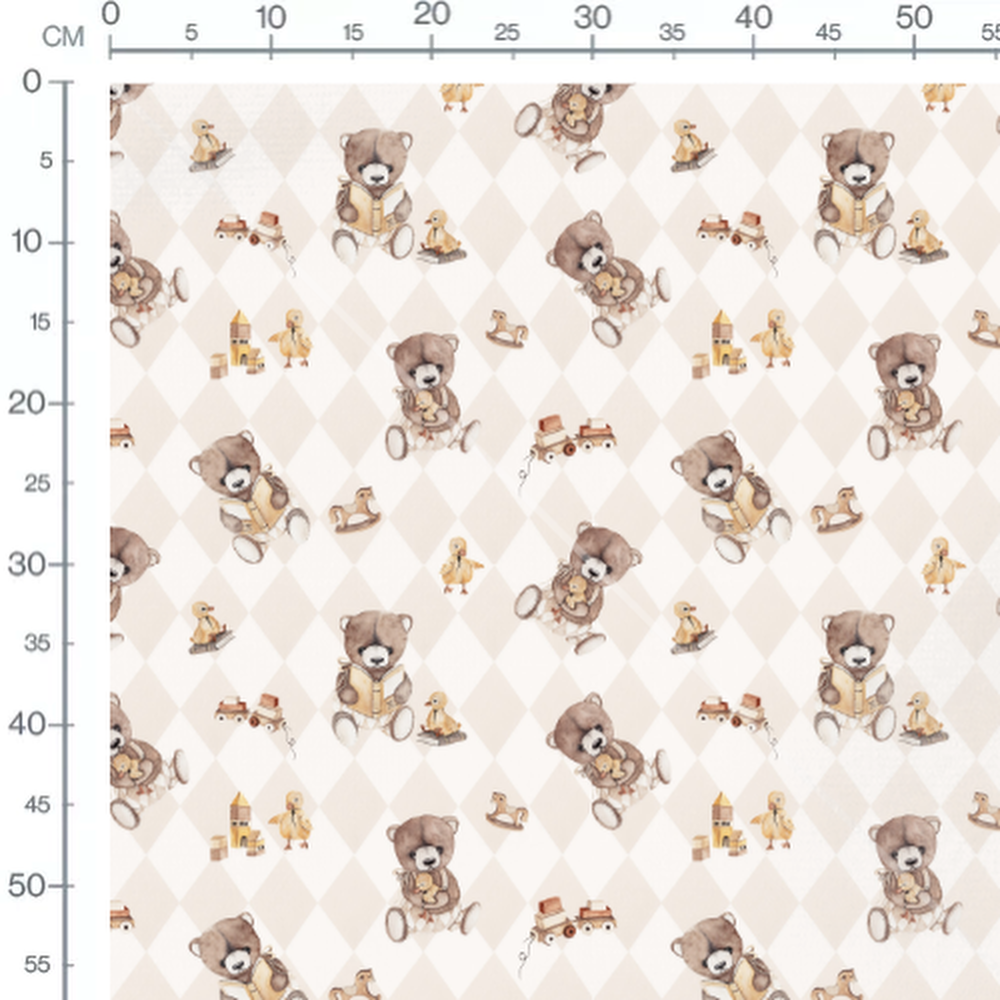 Les oursons tiennent des jouets dans leurs bras. Les canards sont posés à côté de blocs de construction. Les chevaux à bascule et les trains en bois complètent le motif.Les tissus