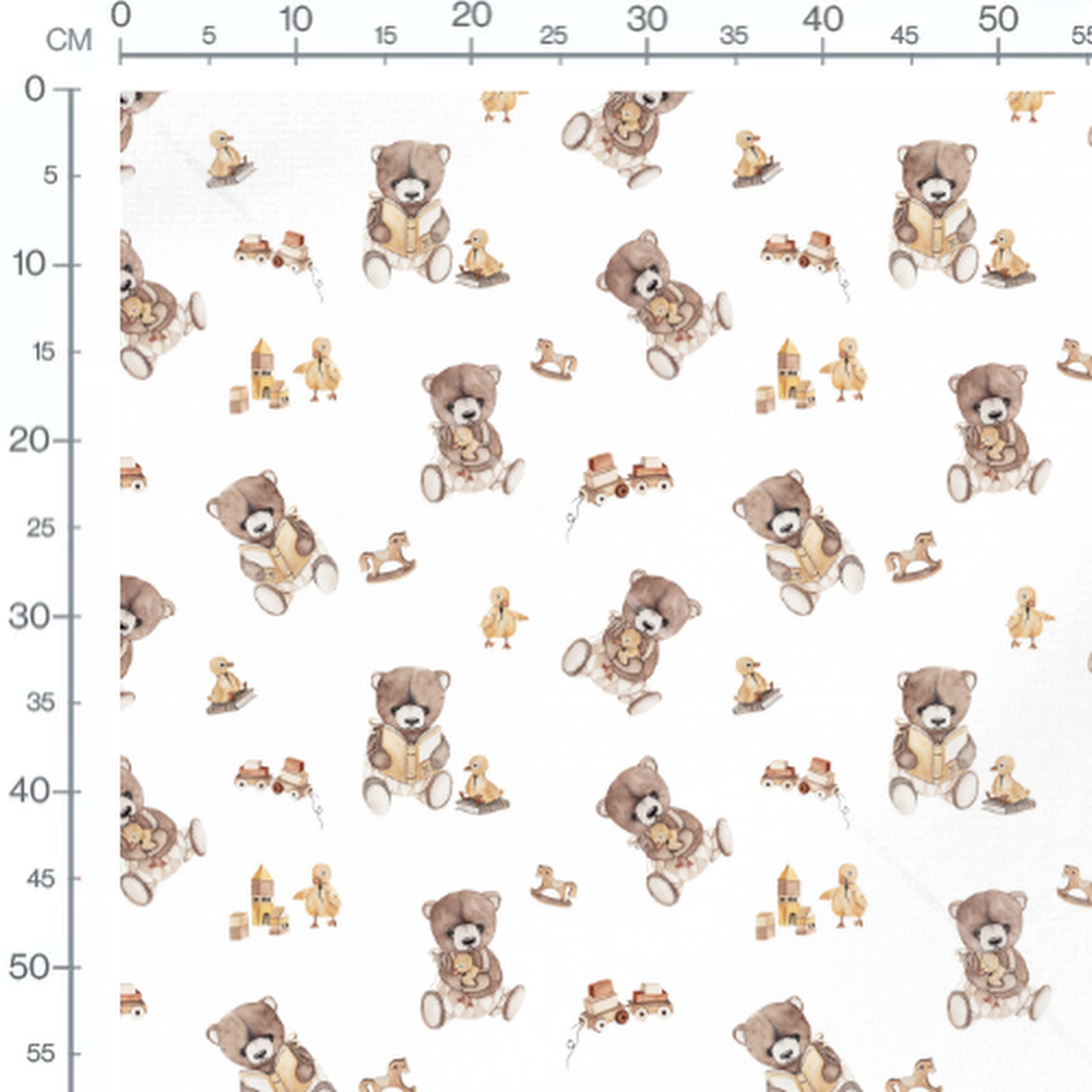 Les oursons tiennent de petits jouets dans les bras. Des trains en bois et des blocs de construction complètent le motif.Les tissus