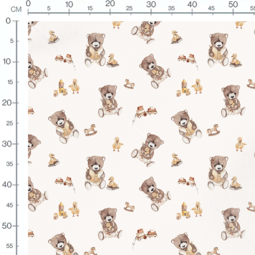 Les oursons tiennent des jouets en peluche. Des canards jaunes sont posés sur des livres. Des trains et chevaux à bascule en bois ajoutent une touche nostalgique.Les tissus