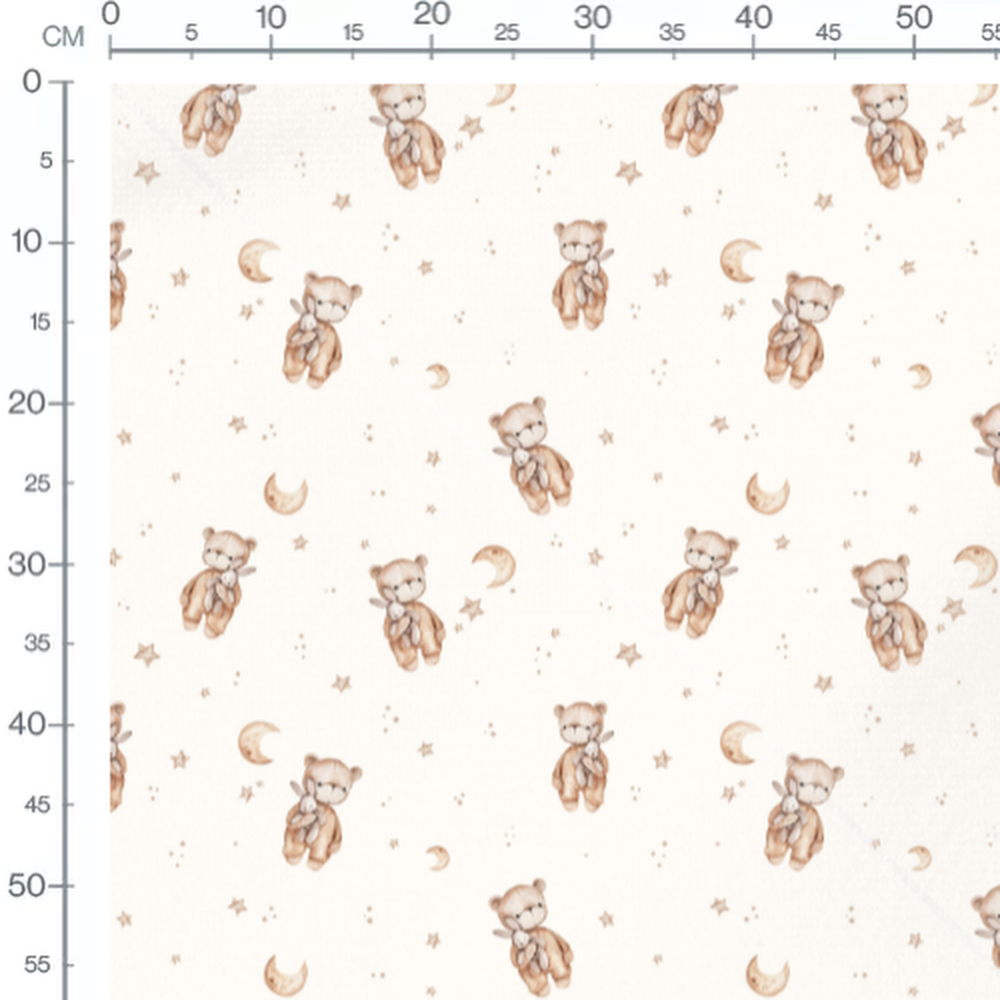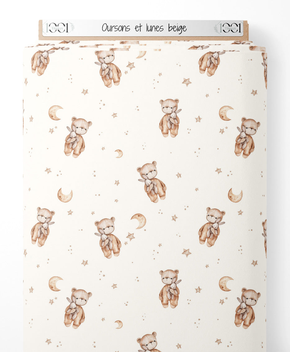 Les oursons sont accompagnés de petits lapins. Des lunes et des étoiles complètent le motif.Les tissus