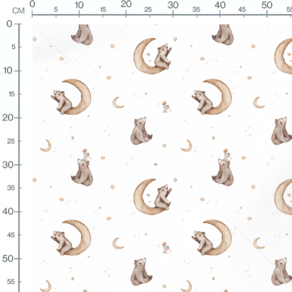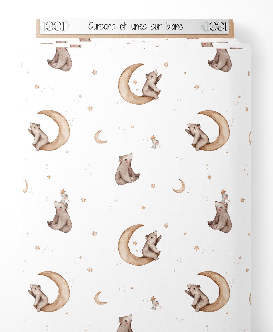 Les oursons sont assis sur des croissants de lune. De petites étoiles et des points parsèment le fond blanc.Les tissus