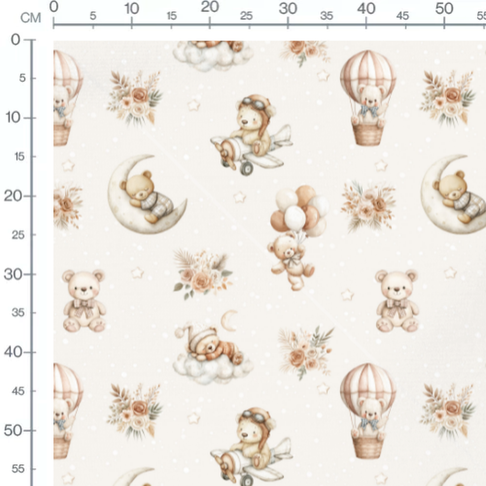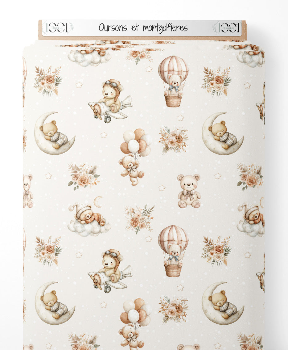 Les oursons portent des vêtements et sont accompagnés de montgolfières et de nuages. Des étoiles et des fleurs aux teintes douces ajoutent une touche rêveuse. Les couleurs principales incluent des tons de beige, brun et rose pâle.Les tissus