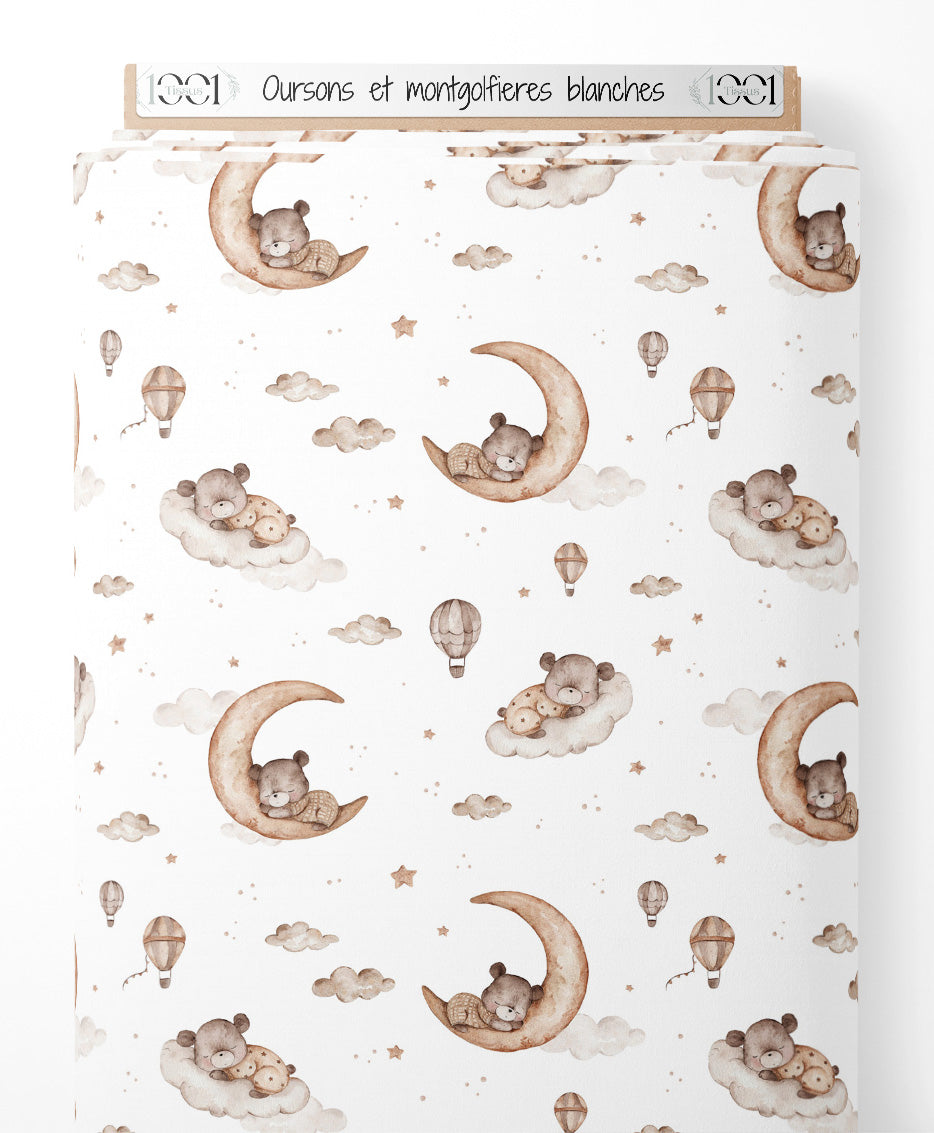 Tissu - Oursons et montgolfières blanches