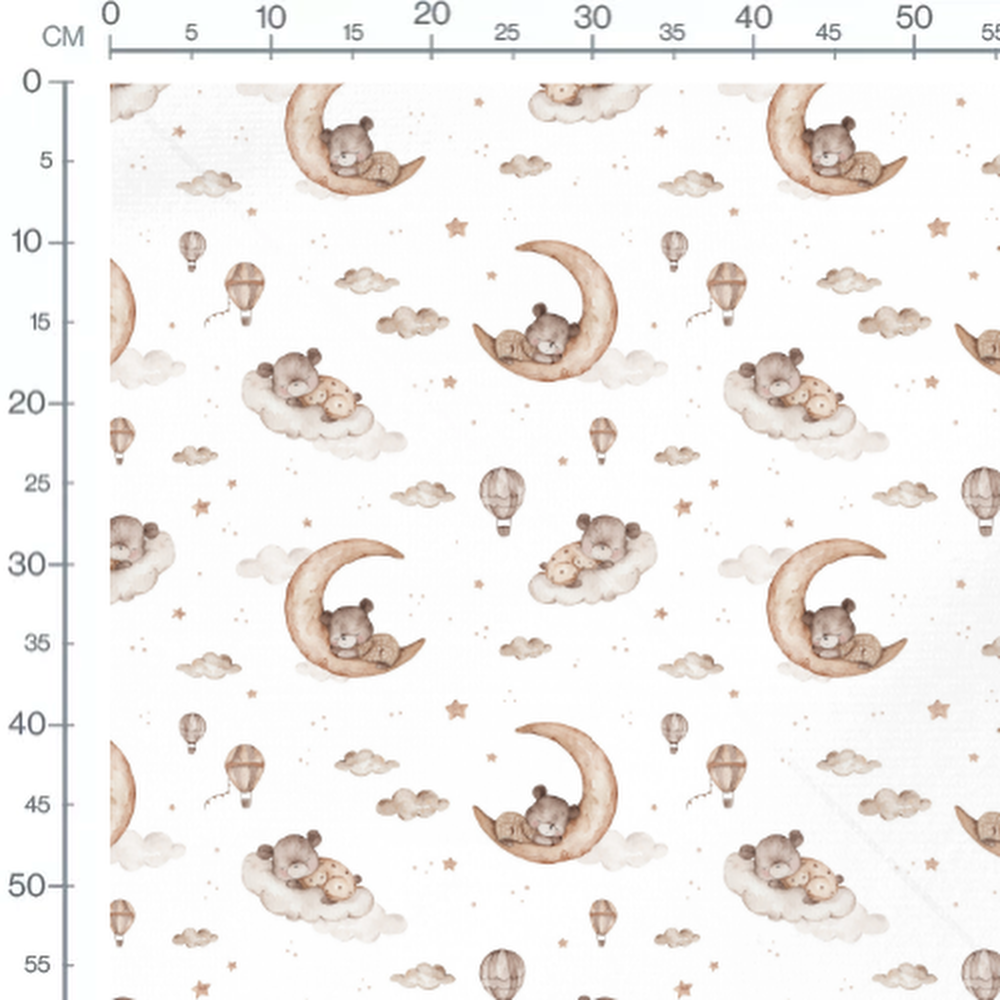 Les oursons dorment paisiblement sur des lunes et des nuages. De petites montgolfières flottent parmi les étoiles. Les couleurs douces créent une ambiance apaisante.Les tissus
