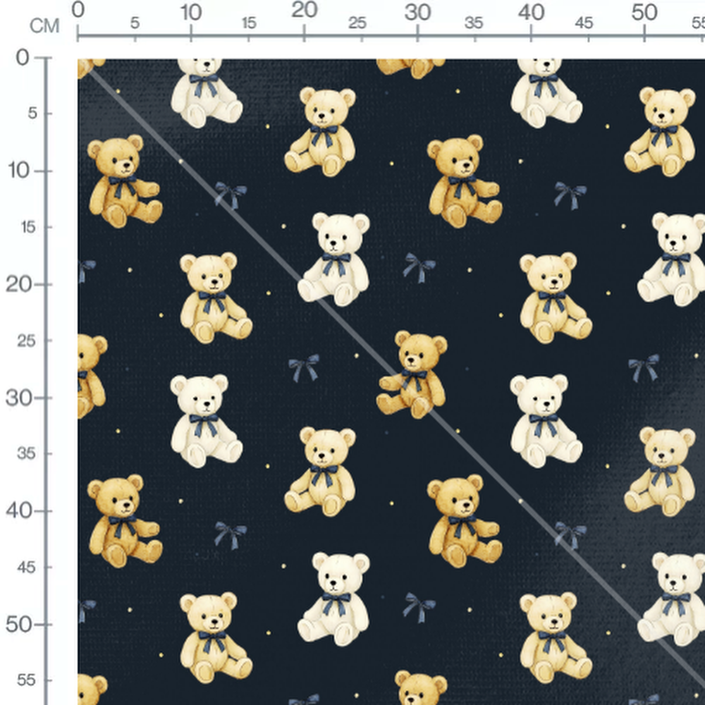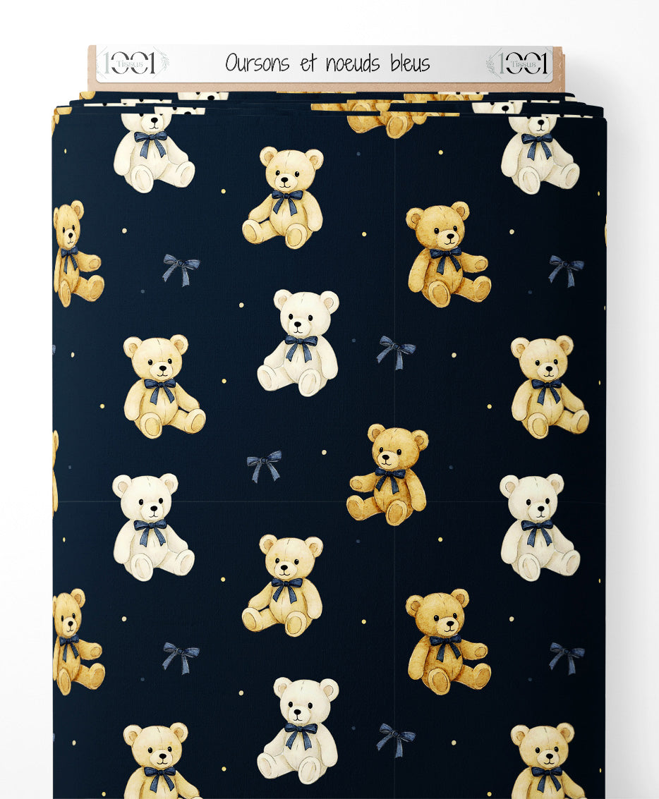 Les oursons sont assis et portent des nœuds papillon bleus. Le fond est parsemé de petits nœuds et points jaunes, ajoutant une touche ludique.Les tissus