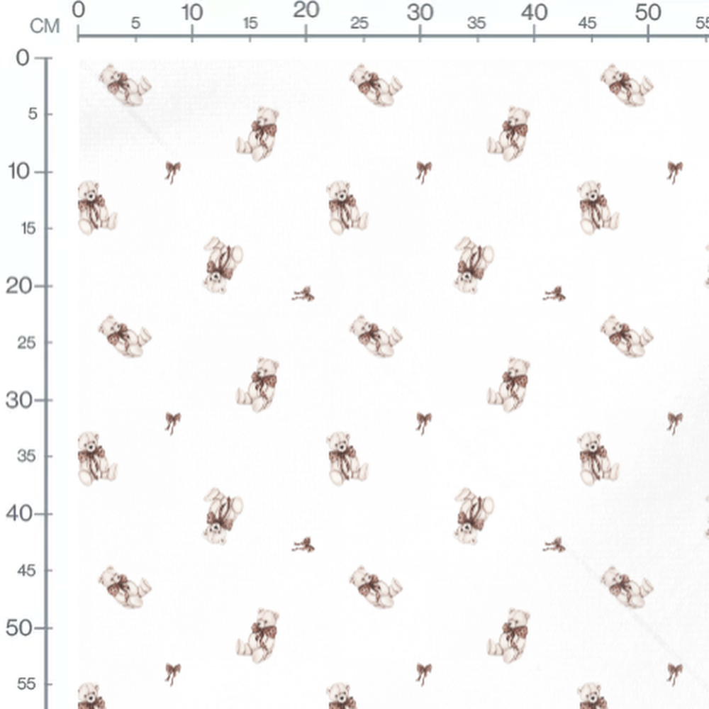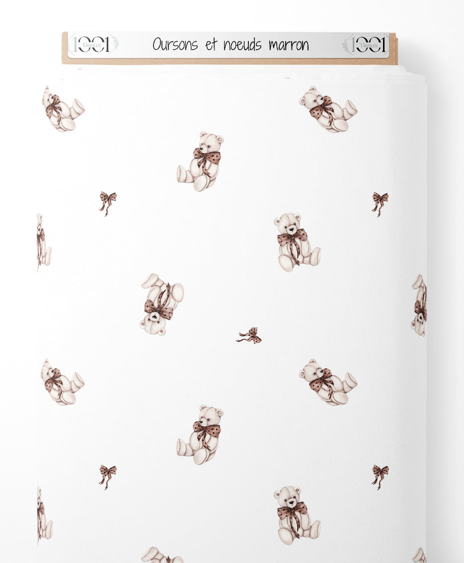 Les oursons sont de couleur crème avec des nœuds marron autour du cou. Les petits nœuds marron ajoutent un détail délicat au motif.Les tissus
