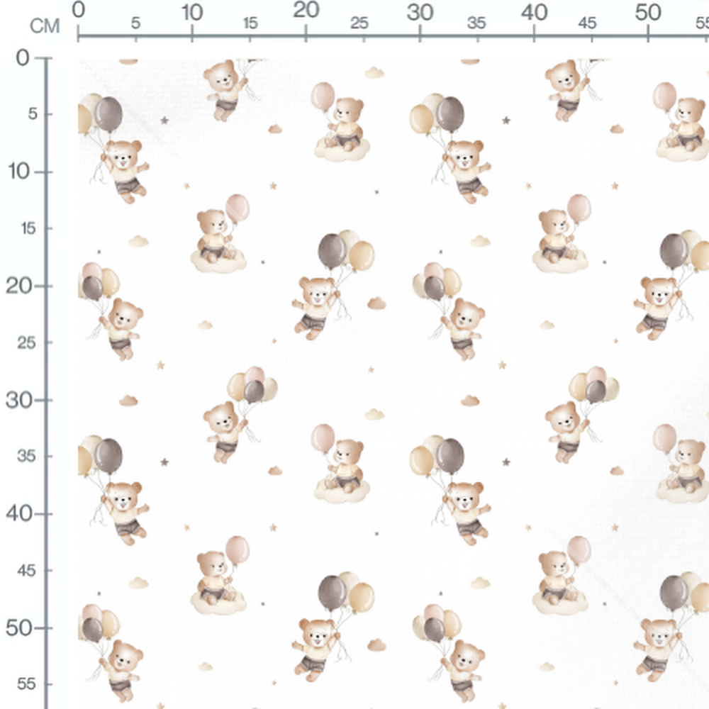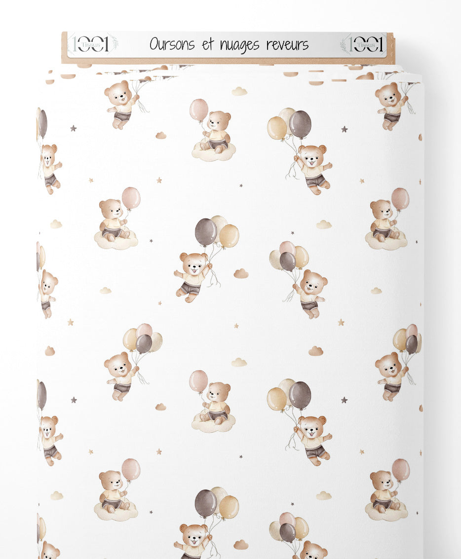 Les oursons sont accompagnés de ballons dans des tons doux de beige et gris. De petits nuages et étoiles ajoutent une touche de rêve au motif.Les tissus