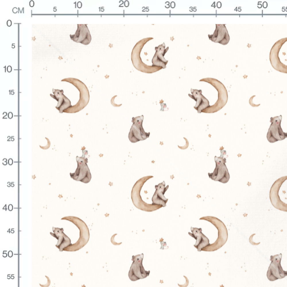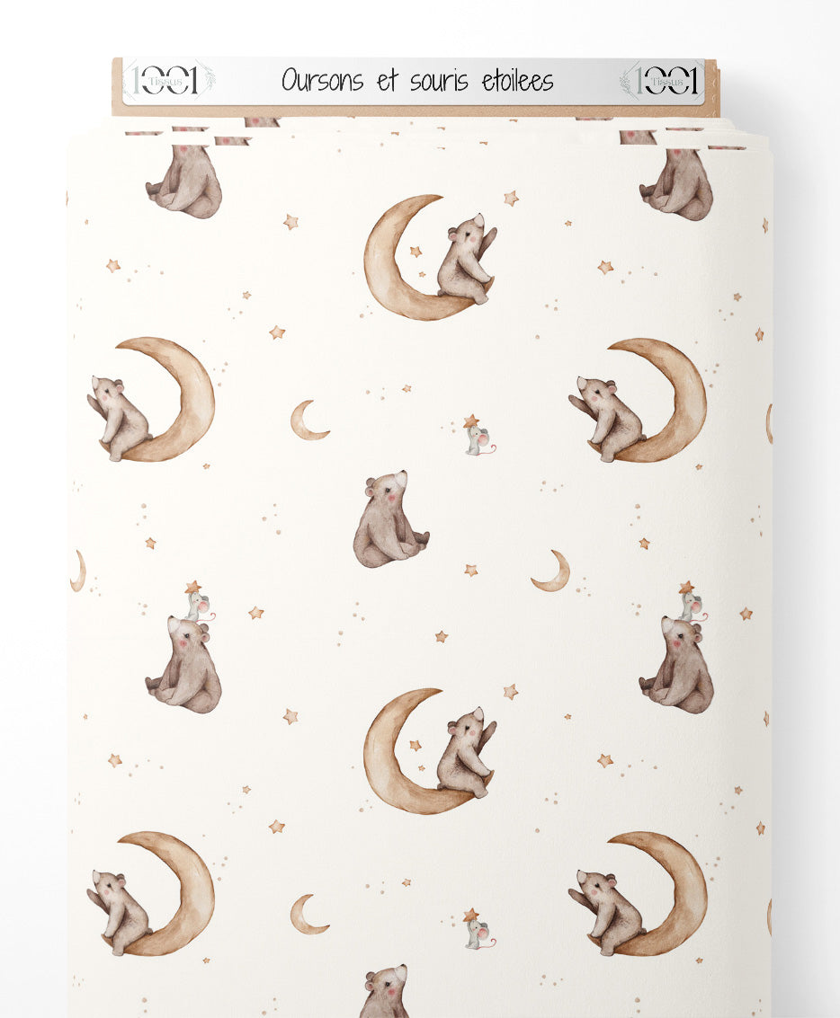 Les oursons sont assis sur des croissants de lune. De petites étoiles dorées parsèment le fond. Les souris portent des chapeaux étoilés.Les tissus