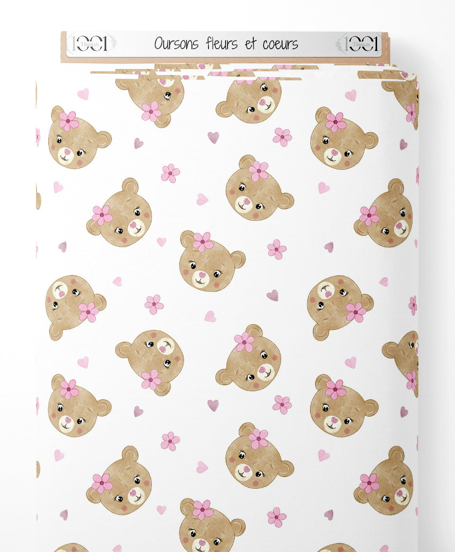 Les oursons ont des joues roses et des yeux expressifs. Les fleurs roses sont placées sur leurs têtes. Les cœurs et les fleurs ajoutent une touche ludique au motif.Les tissus