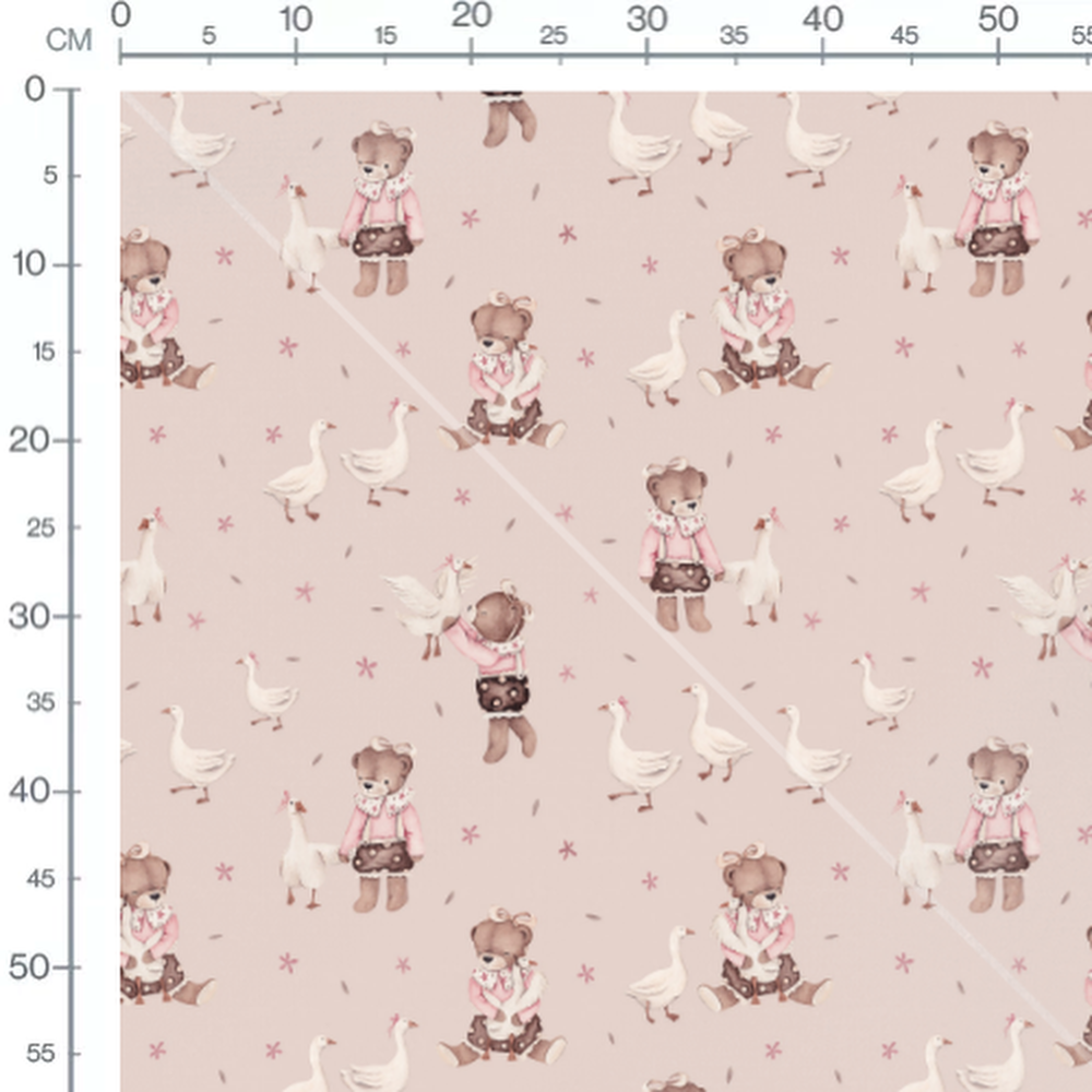Les oursons portent des vêtements roses et marron avec des détails délicats. Les oies blanches sont accompagnées de petites fleurs roses et de feuilles marron clair. Le fond rose pâle ajoute une touche douce et harmonieuse au motif.Les tissus