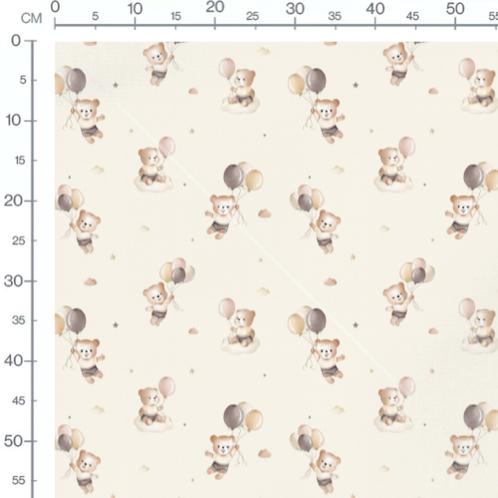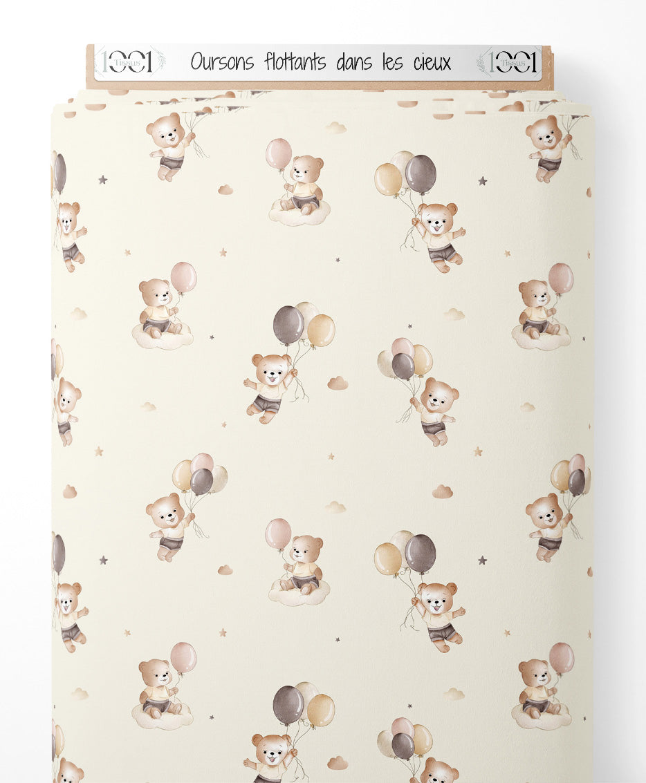 Les oursons sont accompagnés de ballons dans des tons doux de rose, beige et gris. De petites étoiles et nuages ajoutent une touche de rêve au motif. Les oursons semblent flotter joyeusement dans un ciel imaginaire.Les tissus