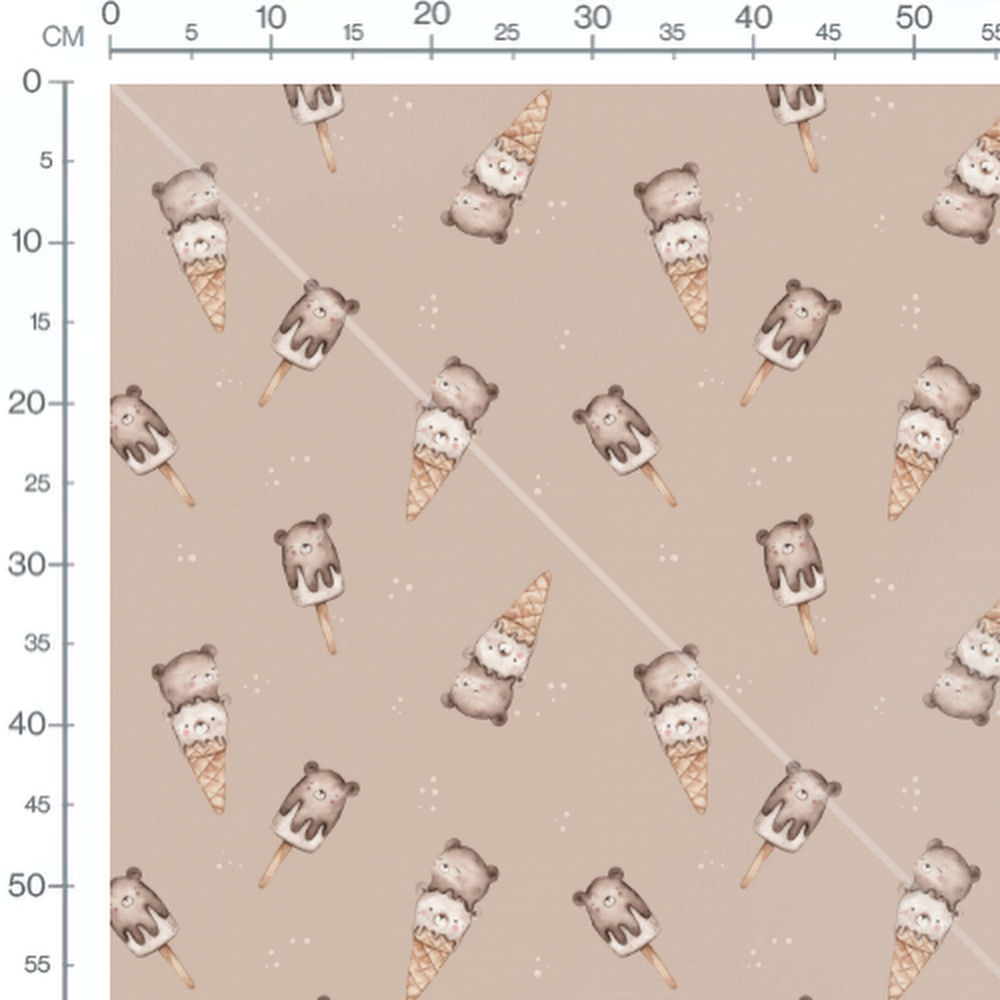 Les oursons sont dessinés avec des expressions adorables. Les cornets sont texturés avec des détails réalistes. Les bâtonnets ajoutent une touche ludique au motif.Les tissus