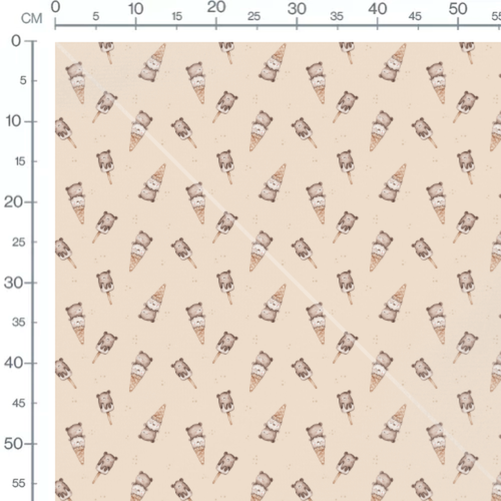 Les oursons sont intégrés dans des cornets et des esquimaux. Les couleurs sont douces avec des nuances de marron et beige.Les tissus