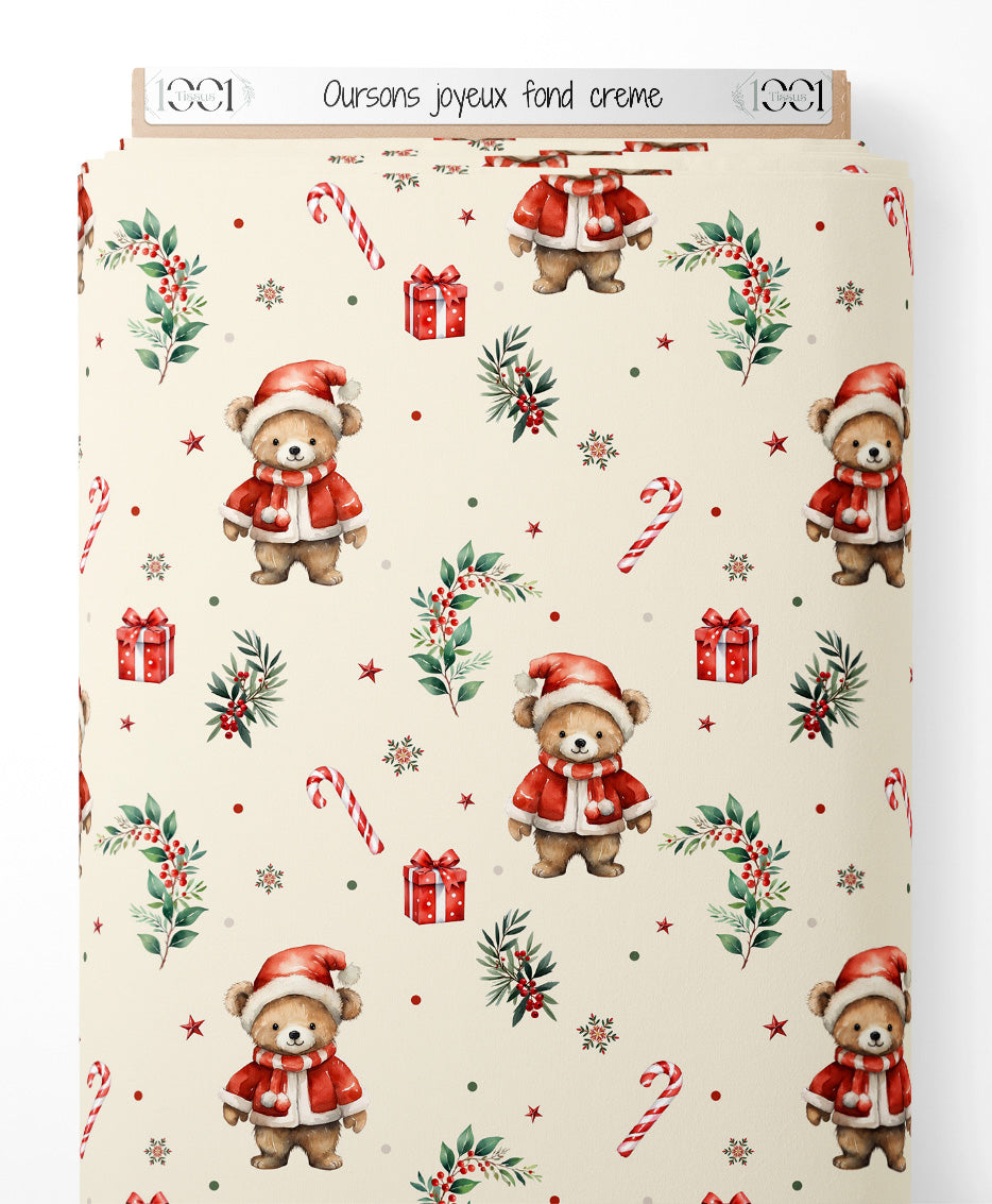 Les oursons portent des chapeaux et écharpes rouges. Des cannes à sucre, des cadeaux rouges et des branches de houx complètent le motif.Les tissus