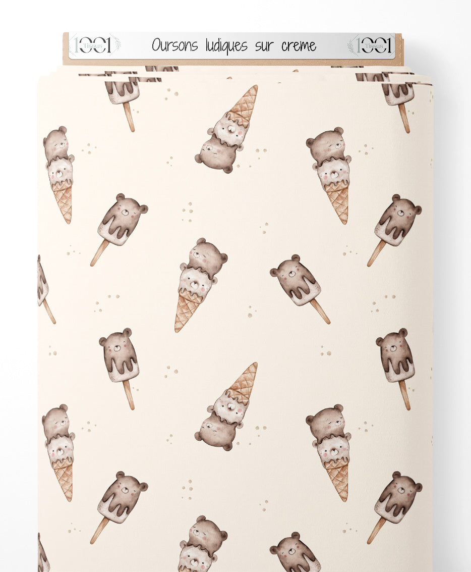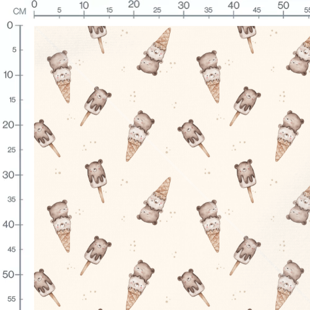 Les oursons sont représentés avec des expressions adorables. Les cornets sont de couleur beige clair et les bâtonnets sont en bois. De petites taches marron clair parsèment le fond crème.Les tissus
