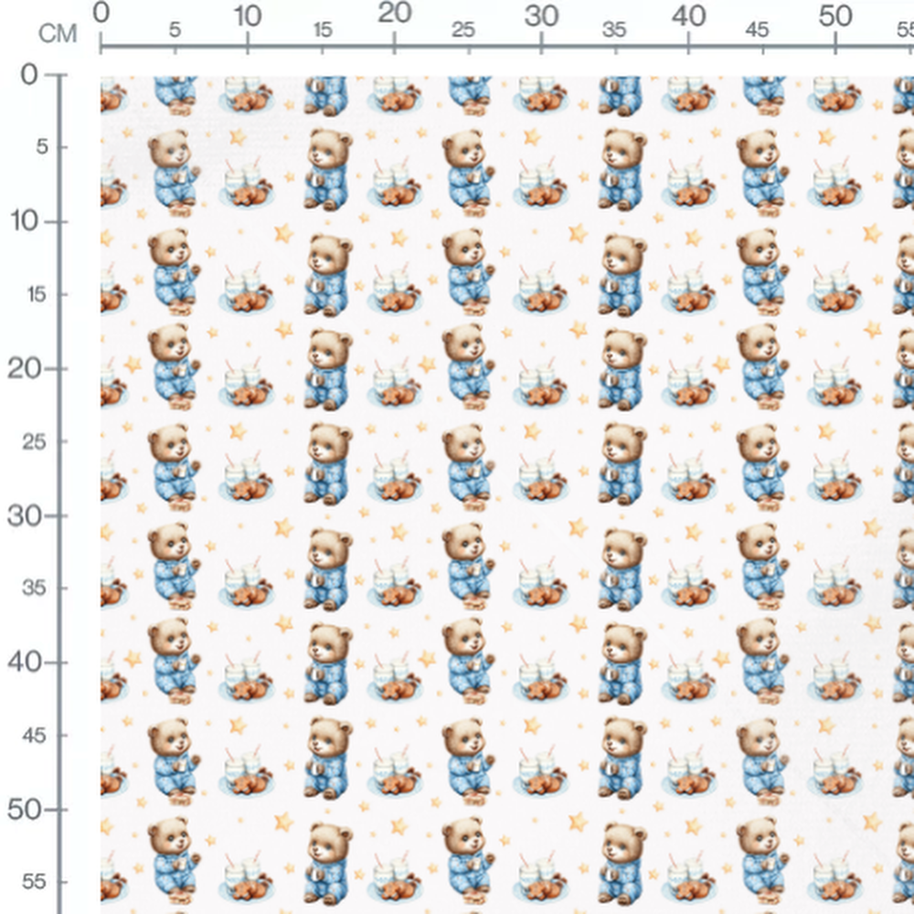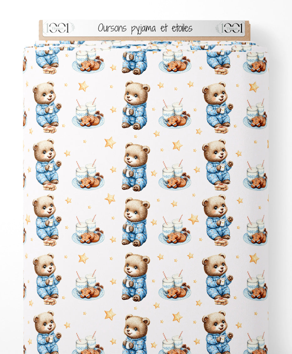 Les oursons tiennent des tasses de lait et sont entourés de biscuits. Des étoiles jaunes ajoutent une touche de douceur au motif.Les tissus