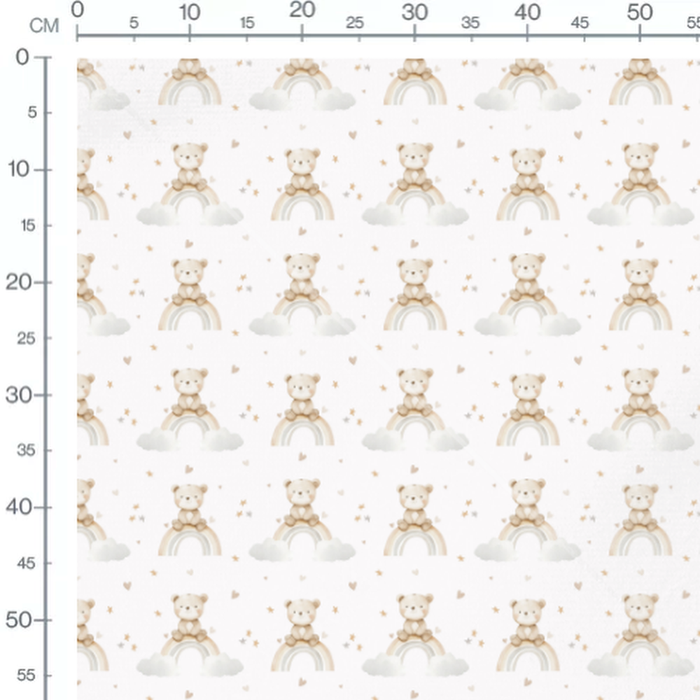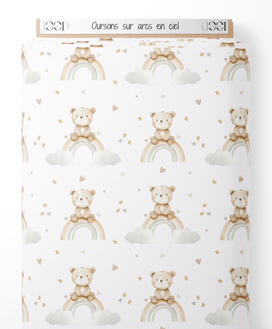 Les oursons sont dessinés dans des tons doux et apaisants. Les arcs-en-ciel sont accompagnés de nuages blancs. Les petits cœurs et étoiles ajoutent une touche délicate au motif.Les tissus