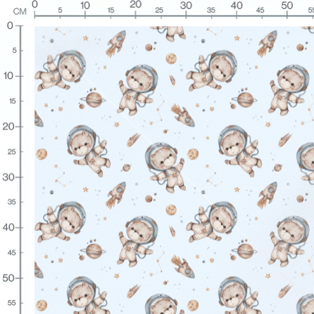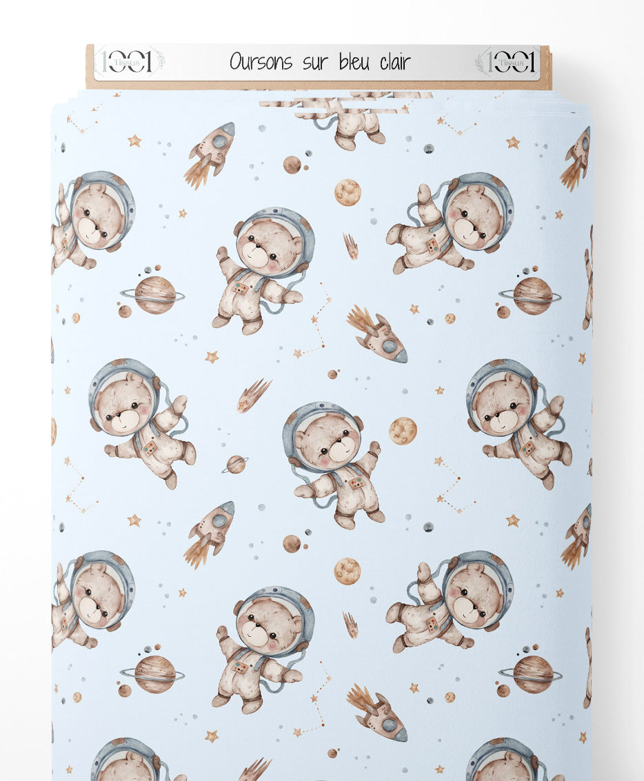 Les oursons portent des casques d'astronaute gris. Des étoiles et des petites planètes complètent le motif.Les tissus