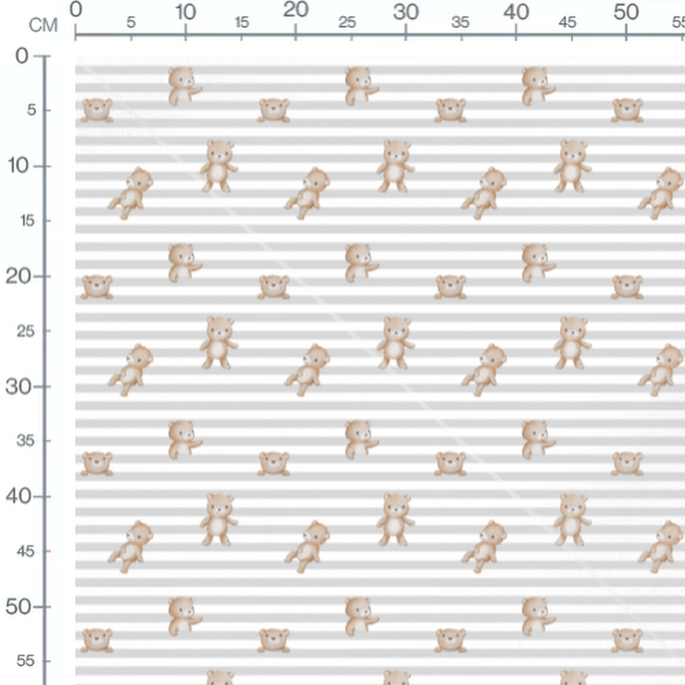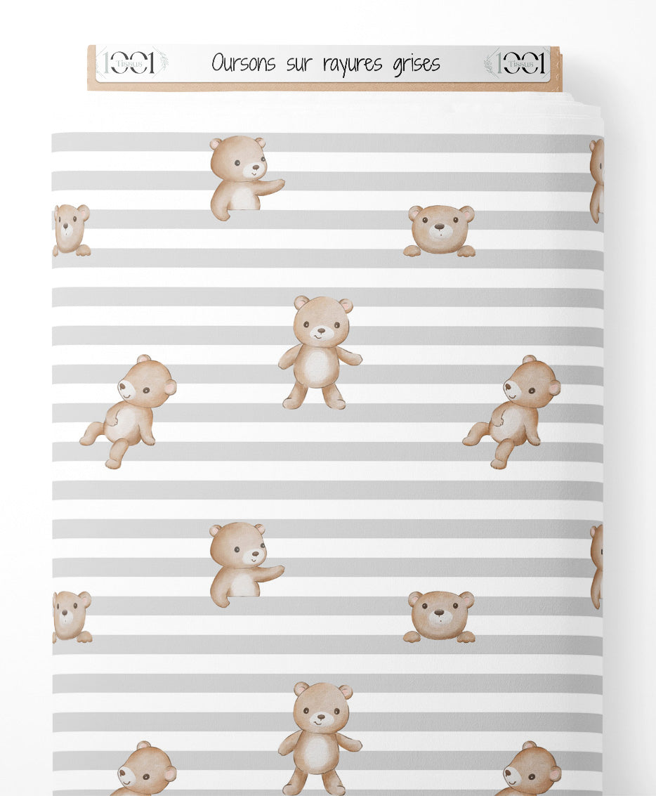 Les oursons ont des expressions douces et sont répartis sur le fond rayé. Le fond alterne entre des rayures grises et blanches, ajoutant un contraste subtil au motif.Les tissus