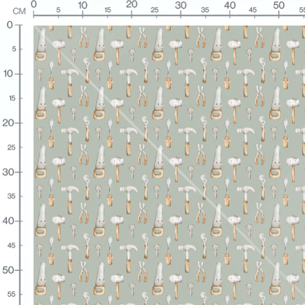 Les outils incluent une scie, un marteau, une clé et une pince. Chaque outil arbore un visage souriant avec des joues roses. Le fond est d'un vert doux et uniforme.Les tissus
