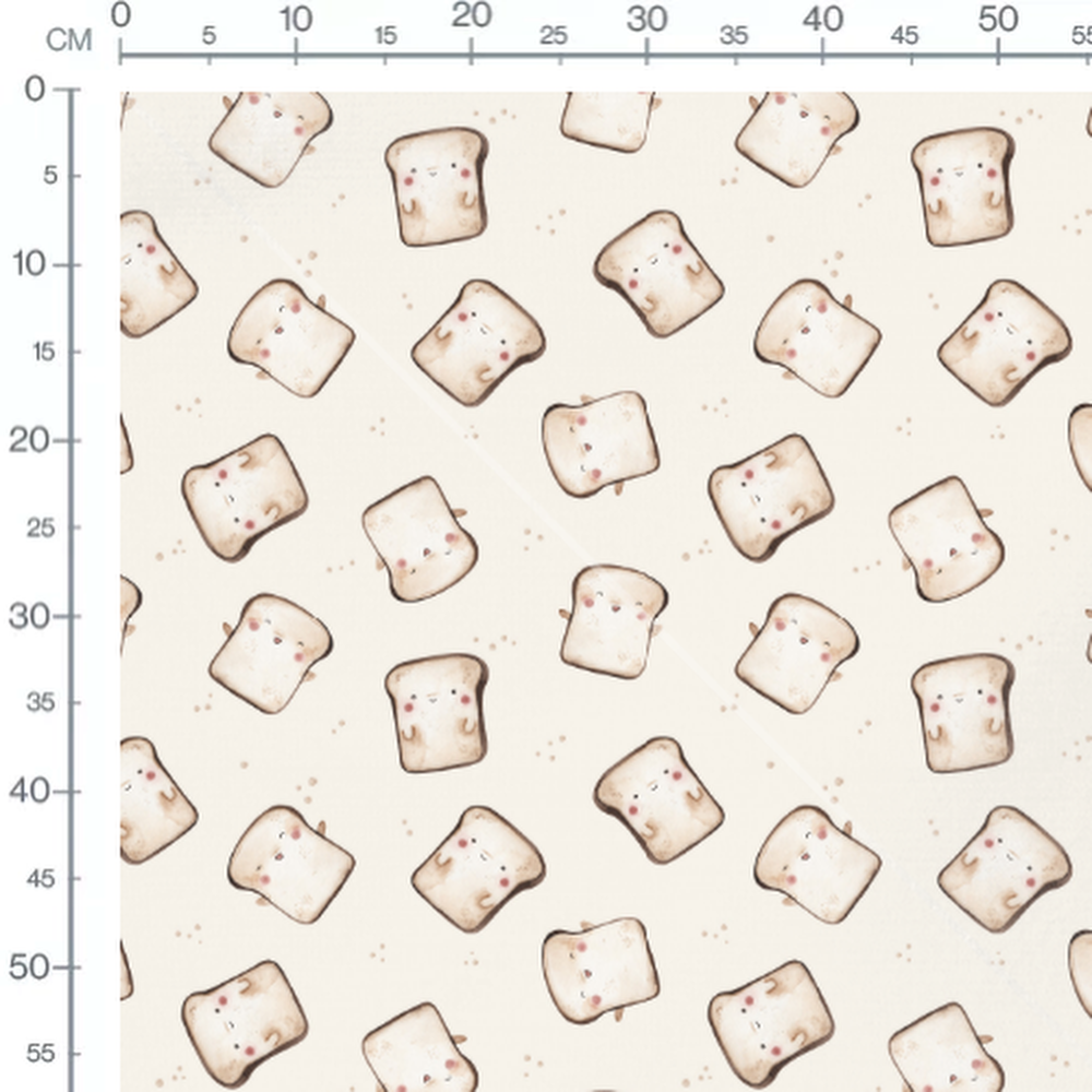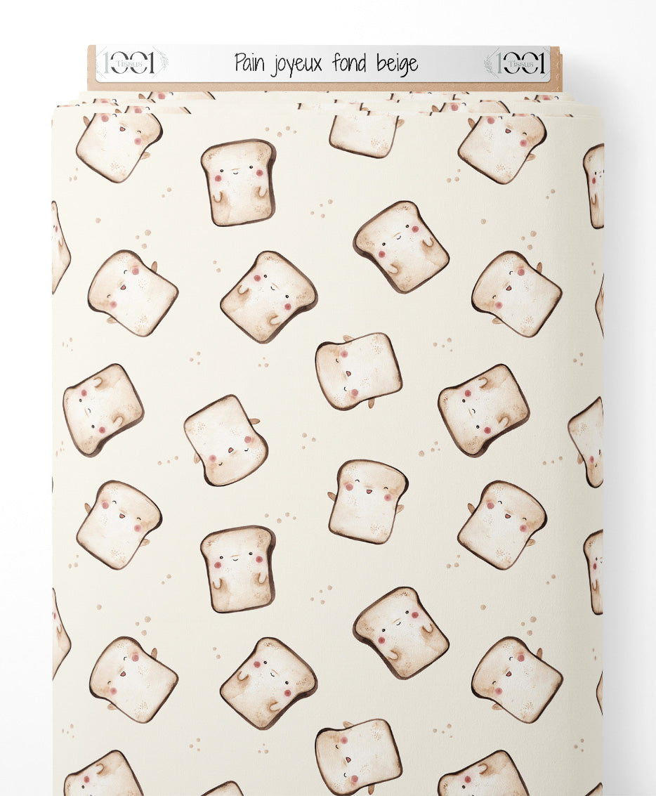 Les tranches de pain ont des joues roses et des expressions joyeuses. Le fond beige est parsemé de petites taches brunes, ajoutant une touche ludique.Les tissus