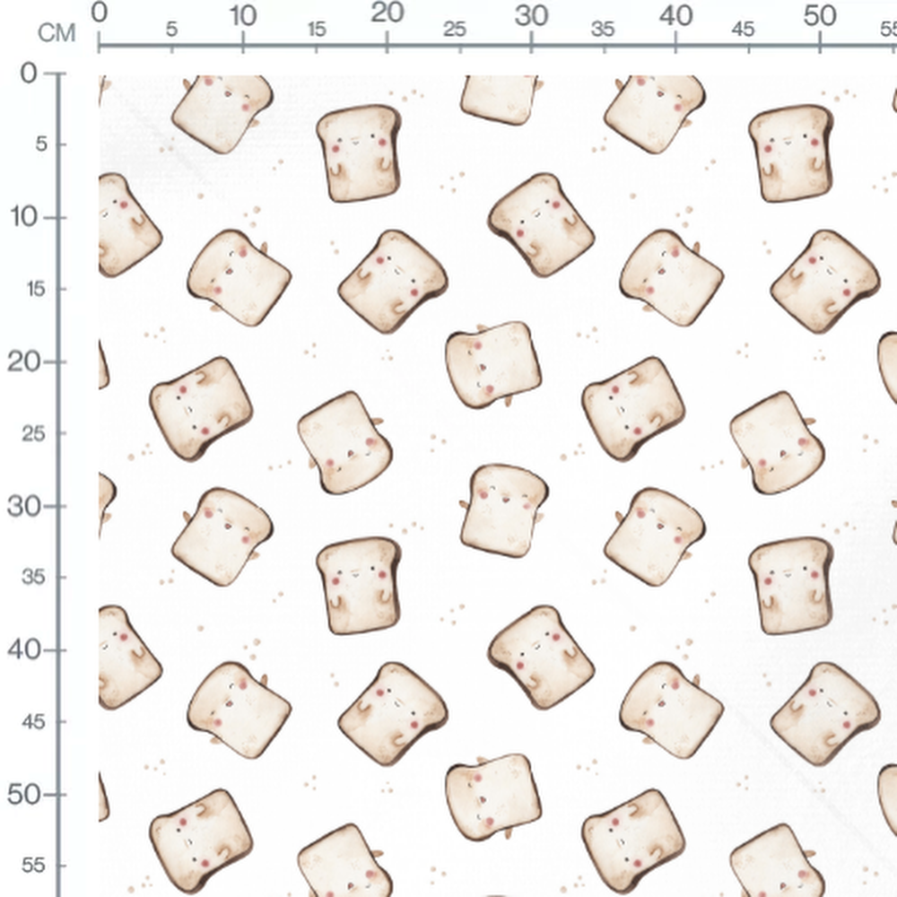 Les tranches de pain présentent de petits visages avec des joues roses. Des points marron clair entourent les tranches sur le fond blanc.Les tissus