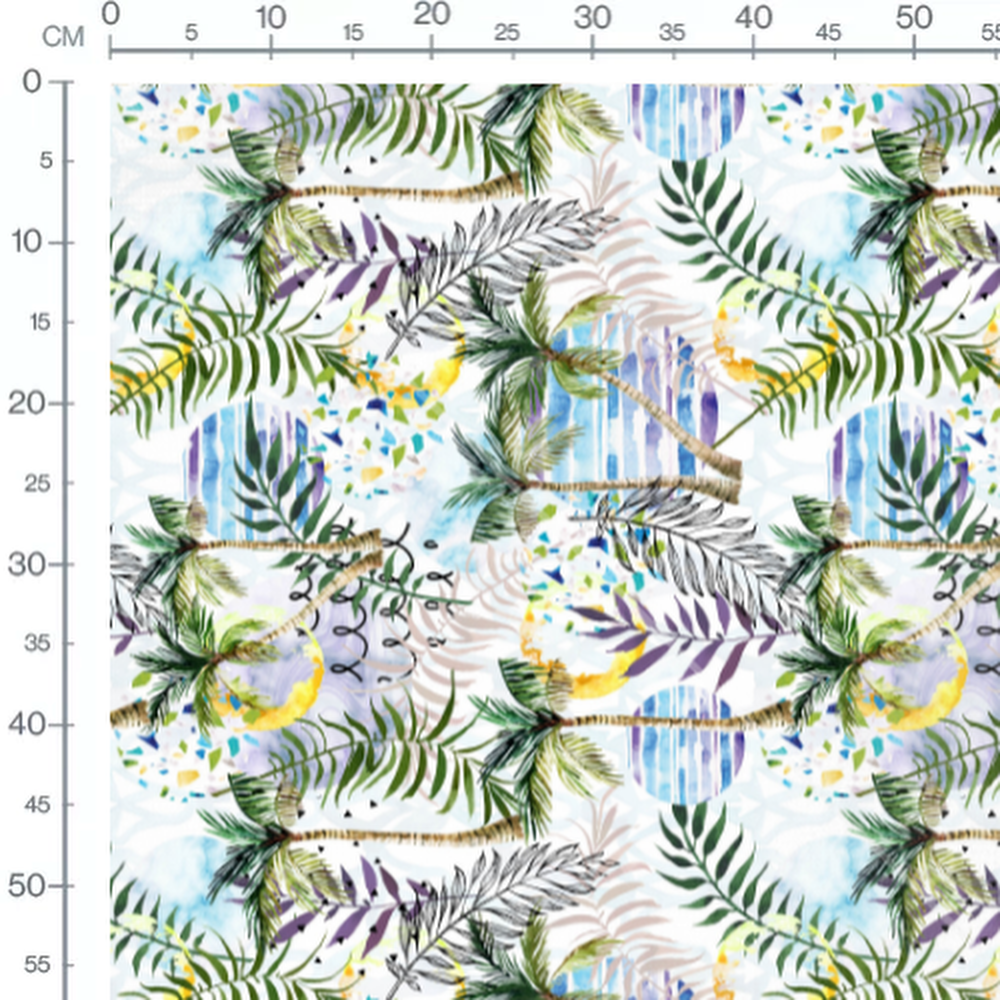 Les feuilles de palmier sont accompagnées de motifs géométriques en bleu et jaune. Le fond aquarelle ajoute des touches de couleur variées. Les nuances de vert et violet des feuilles créent un contraste avec le fond coloré.Les tissus