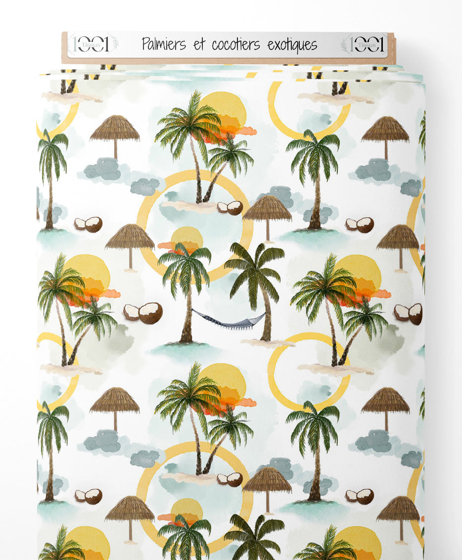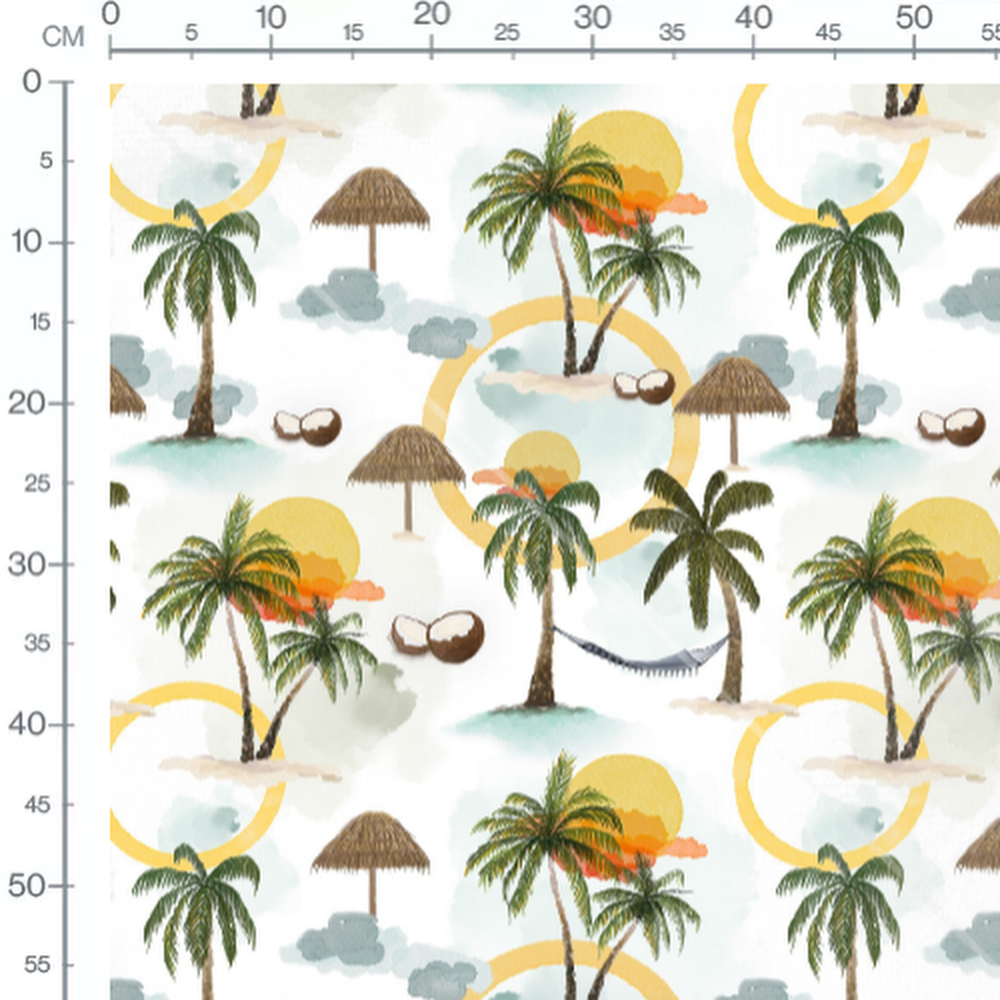 Les palmiers sont entourés de cocotiers ouverts et fermés. Des huttes en paille sont dispersées avec des hamacs suspendus. Le fond présente des soleils jaunes et des nuages gris clair.Les tissus