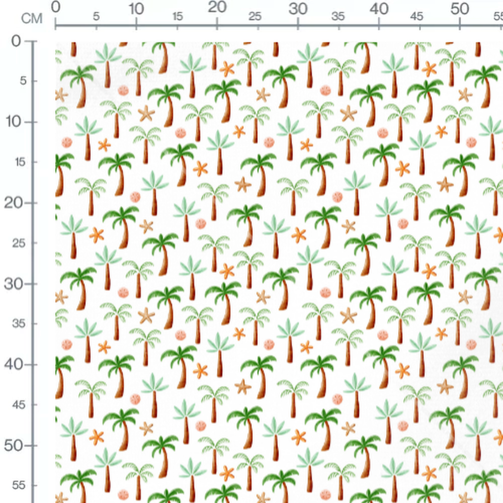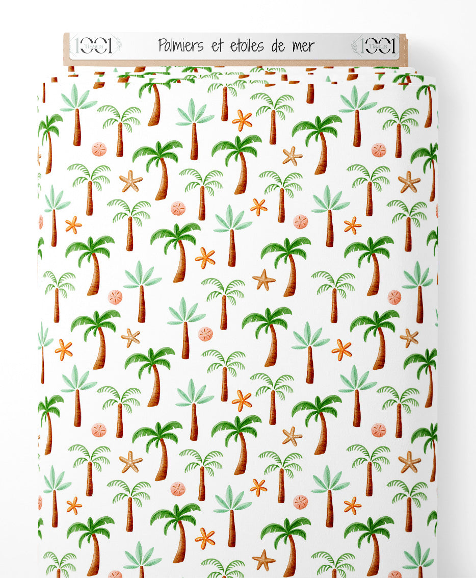 Les palmiers sont de différentes tailles avec des troncs marron. Les étoiles de mer sont de couleur orange vif. Les coquillages sont ronds et de couleur rose pâle.Les tissus