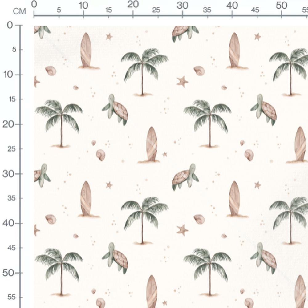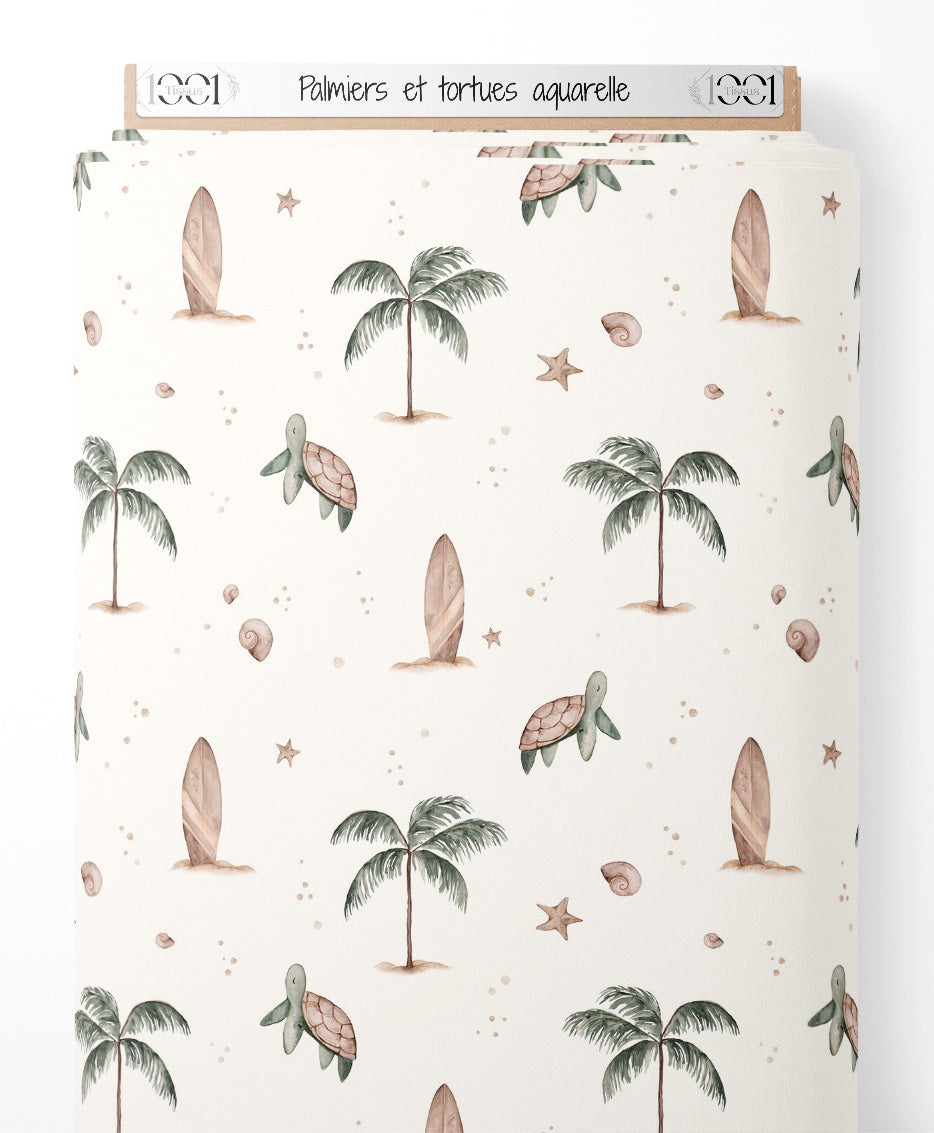 Des étoiles de mer beige et des coquillages ajoutent une touche marine. Les planches de surf sont posées sur le sable. Les tortues nagent paisiblement autour des palmiers.Les tissus