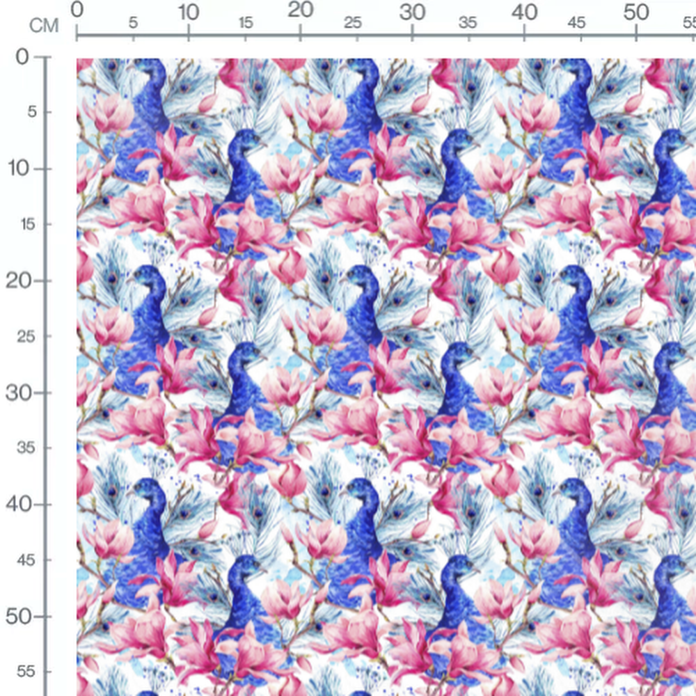 Les paons sont représentés avec des nuances de bleu vif. Les fleurs roses contrastent avec les plumes détaillées des paons. Les magnolias ajoutent une touche florale délicate au motif.Les tissus