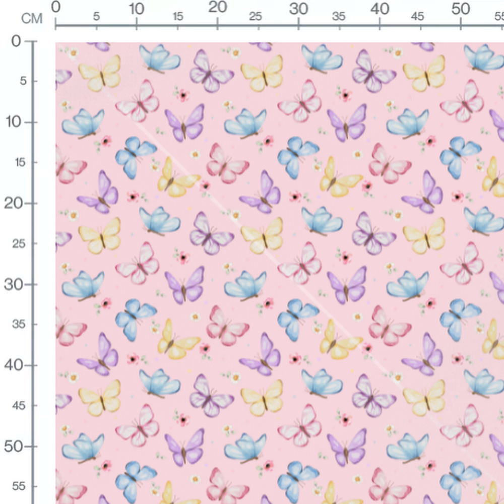 Les papillons sont de couleurs variées, incluant bleu, violet, jaune et rose. Les fleurs sont délicates avec des nuances de rose et de blanc. Le fond rose ajoute une touche douce et harmonieuse à l'ensemble.Les tissus