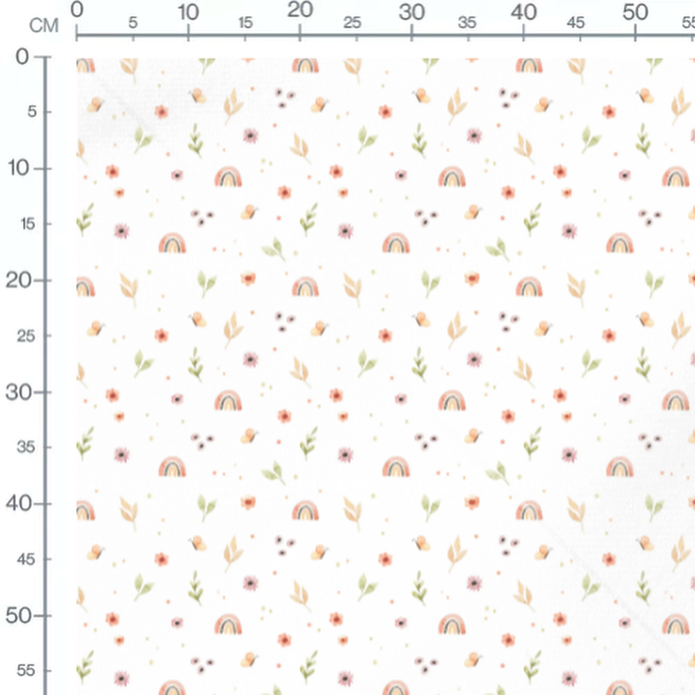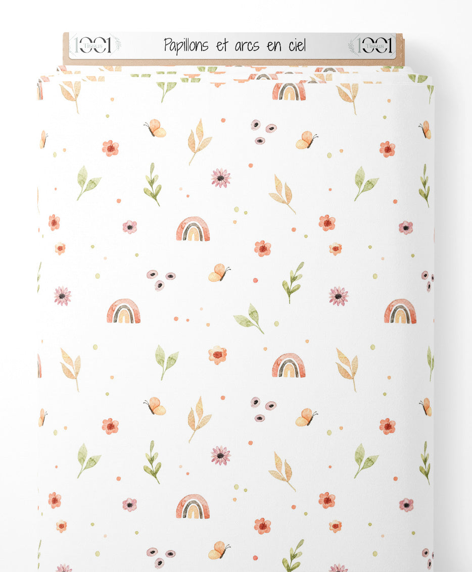 Petites fleurs roses et feuilles vertes ajoutent une touche de couleur. Points colorés éparpillés sur le fond. Arcs-en-ciel aux teintes douces complètent le motif.Les tissus