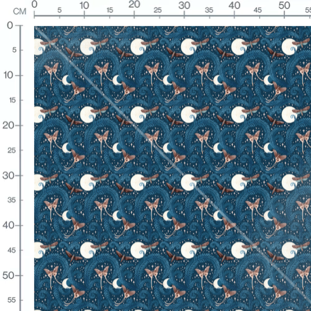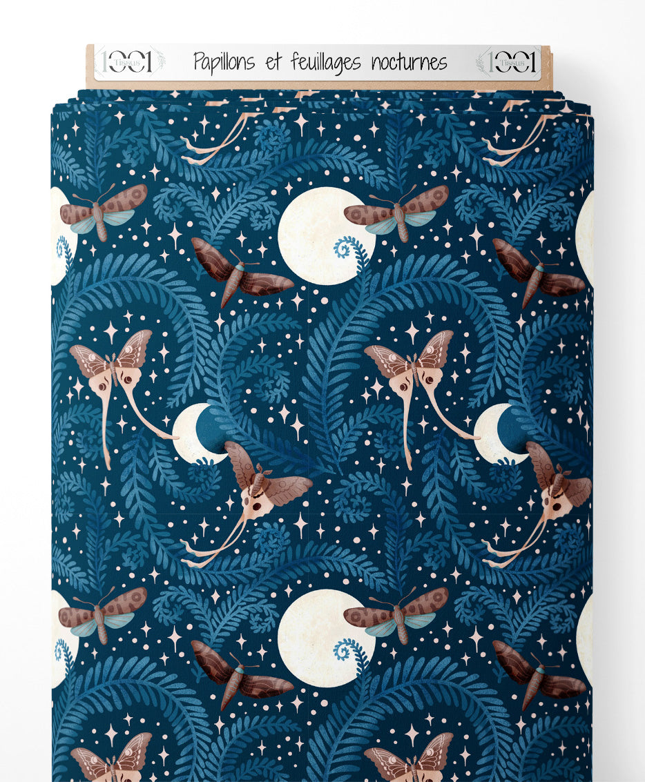 Des étoiles blanches parsèment le fond bleu nuit. Les papillons ont des motifs détaillés sur leurs ailes. Les lunes ajoutent une touche lumineuse au motif.Les tissus