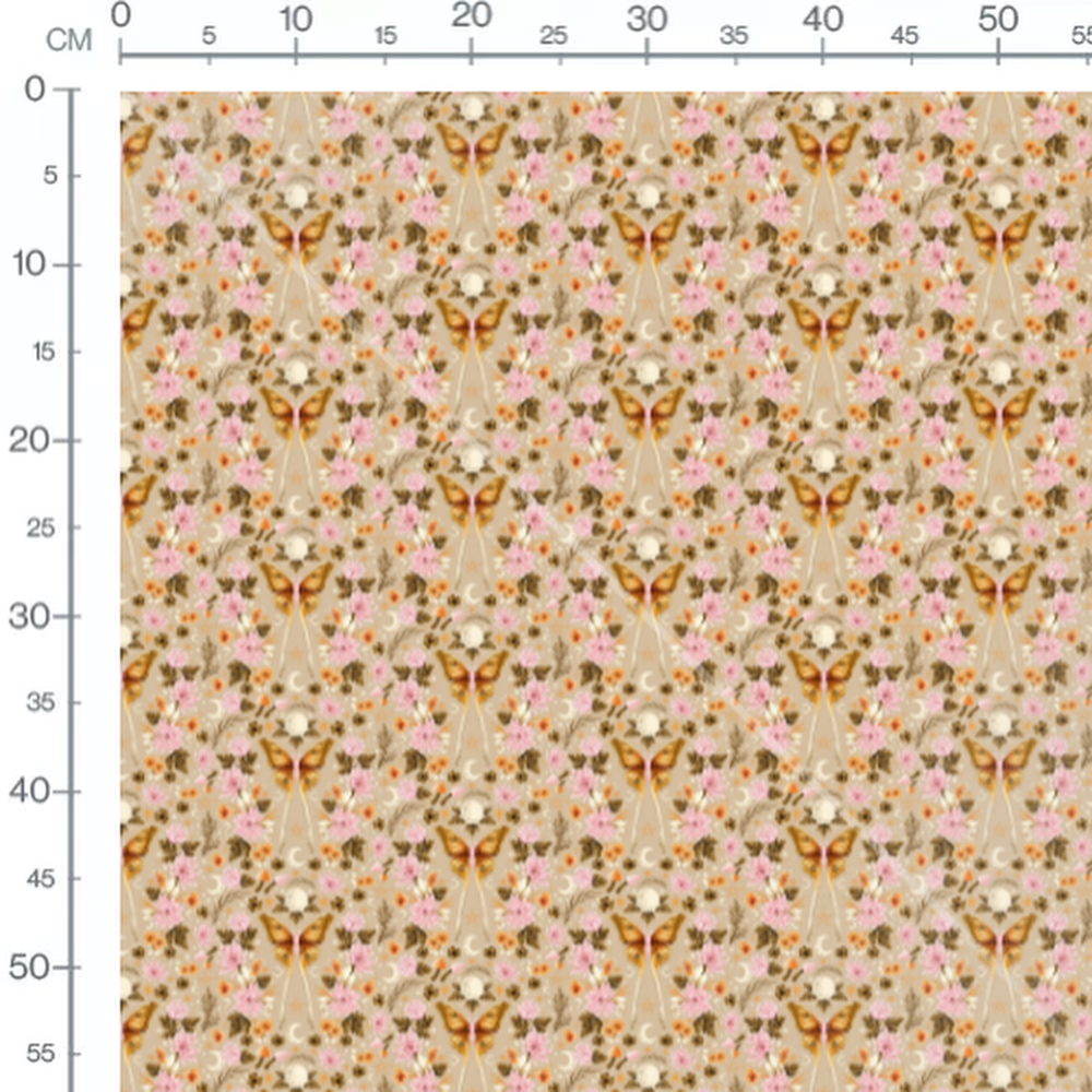 Les fleurs roses sont entourées de feuillages verts et bruns. Des champignons bruns ajoutent une touche forestière. Des lunes et étoiles blanches complètent le motif. Les papillons marron sont détaillés avec des motifs délicats.Les tissus