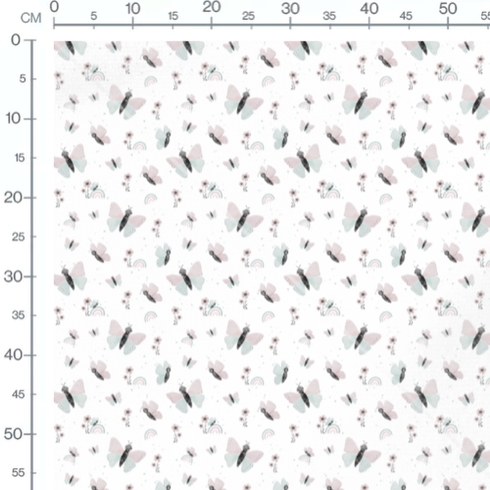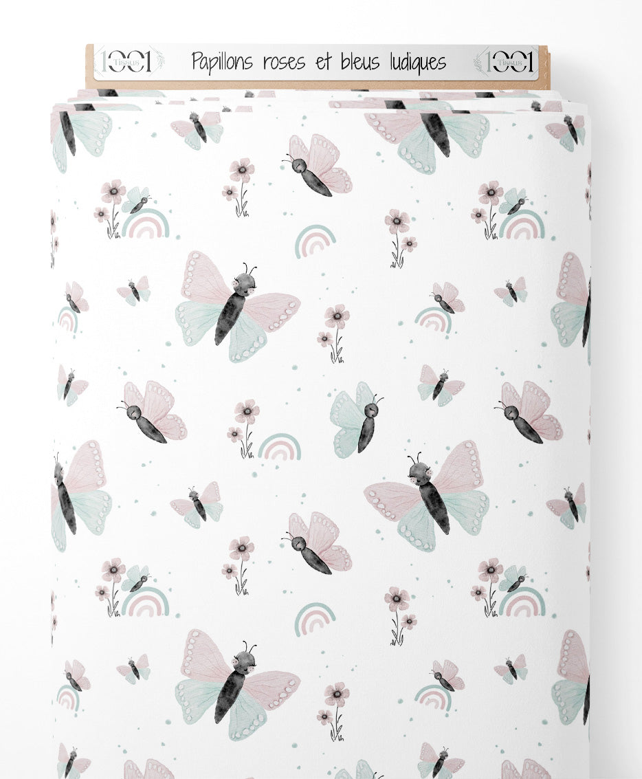 Les papillons ont des ailes délicatement colorées en rose et bleu. De petites fleurs roses ajoutent une touche florale. Des arcs-en-ciel pastel apportent une touche ludique au motif.Les tissus