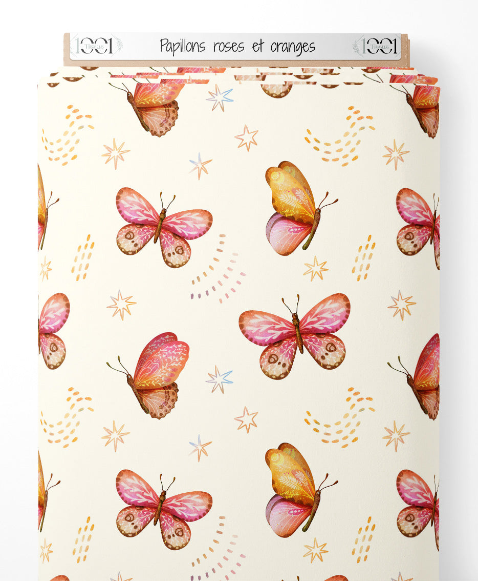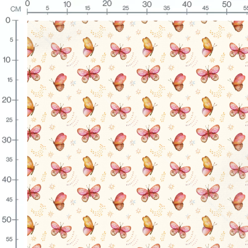 Les papillons présentent des motifs détaillés sur leurs ailes. Des étoiles et des lignes courbes ajoutent une touche artistique au fond crème.Les tissus