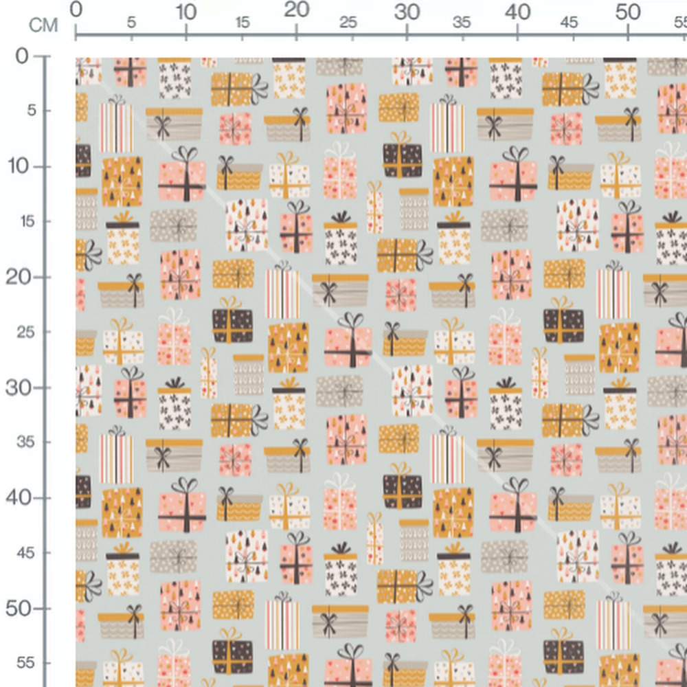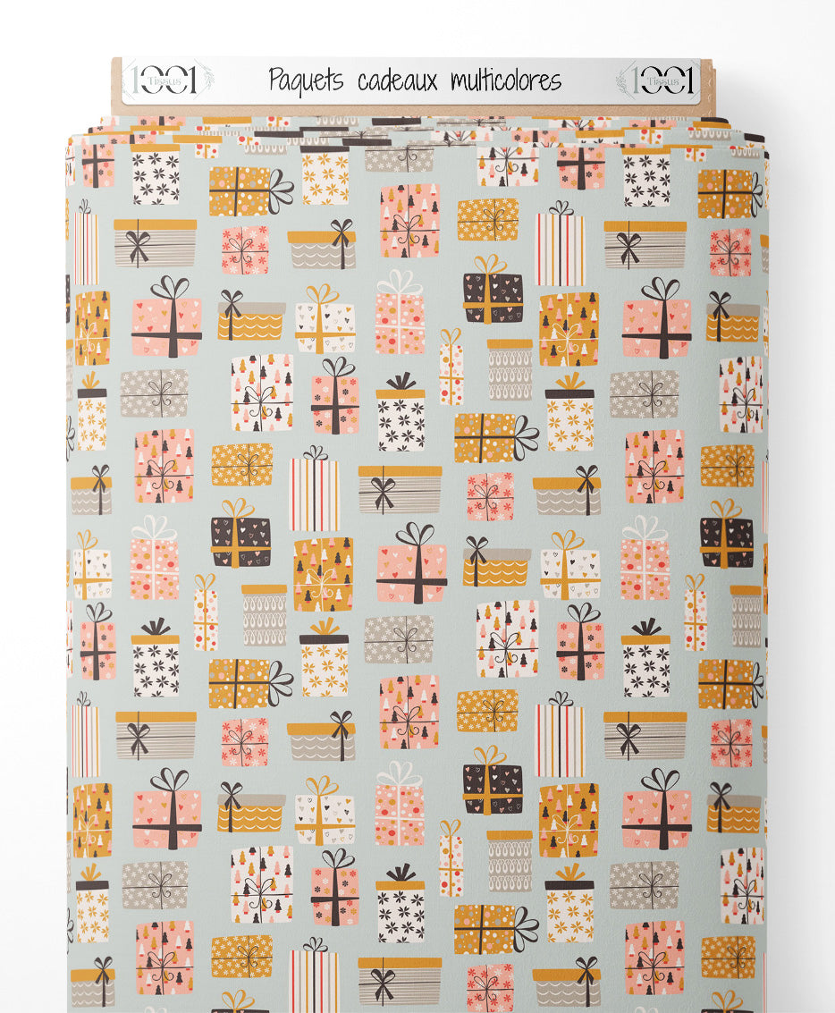 Les paquets sont ornés de motifs géométriques et floraux. Les couleurs incluent du rose, du beige, du gris et du doré. Chaque cadeau est décoré avec un ruban distinctif. Les motifs incluent des sapins, des étoiles et des rayures.Les tissus