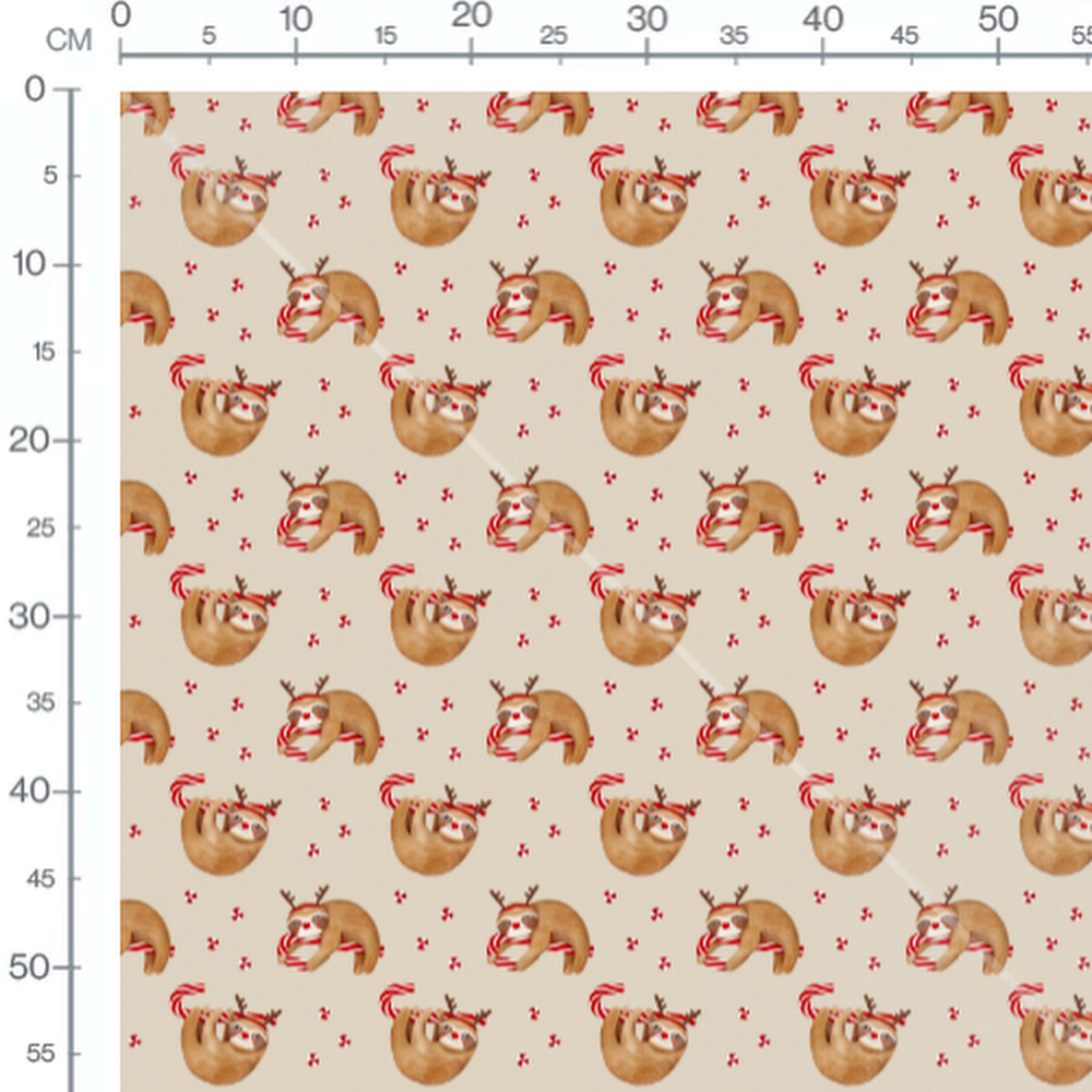Les paresseux portent des bois de renne et tiennent des cannes à sucre rouges. Des bonbons rouges et blancs ajoutent une touche festive. Le fond beige met en valeur les motifs joyeux.Les tissus