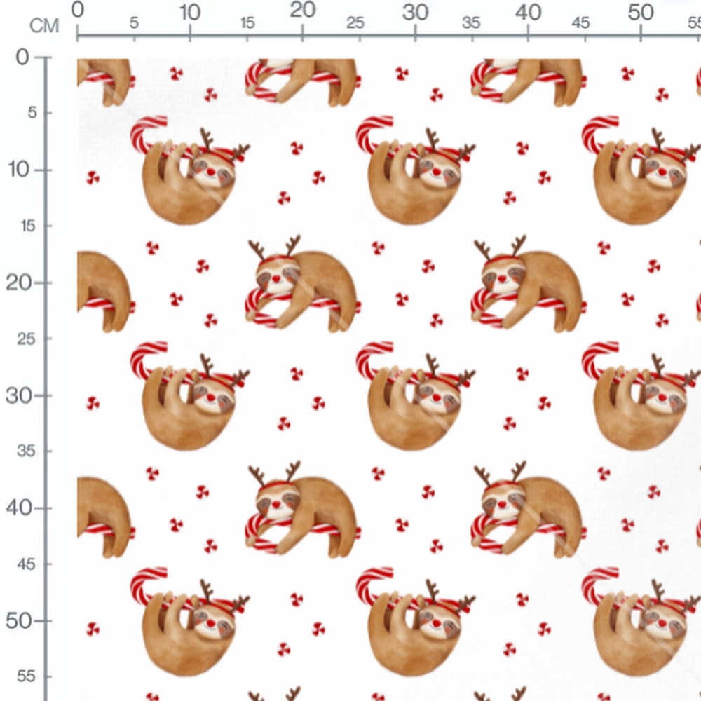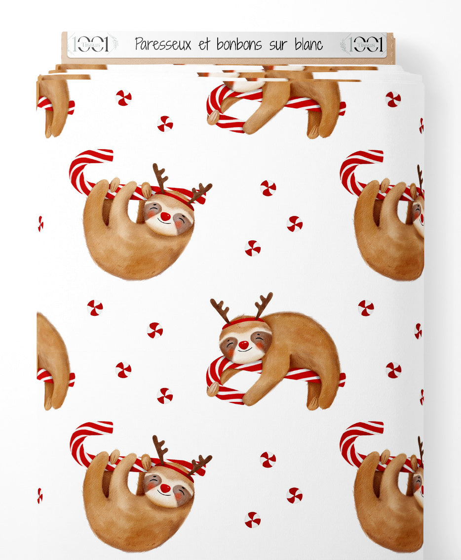 Les paresseux portent des bois de renne et tiennent des cannes rouges et blanches. De petits bonbons rouges et blancs sont éparpillés sur le fond blanc.Les tissus
