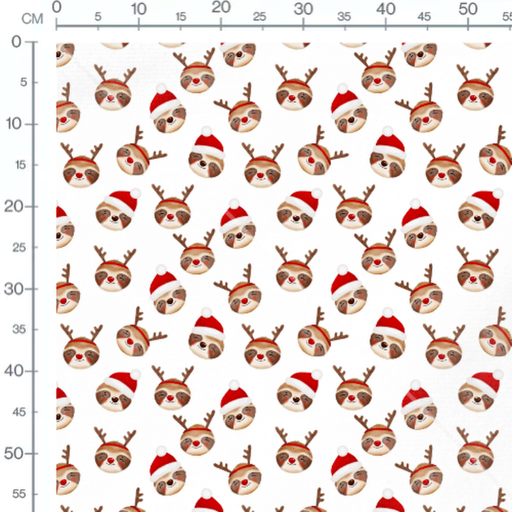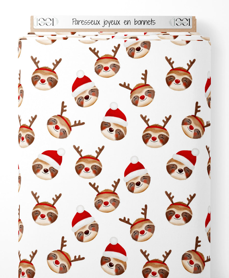 Les paresseux souriants arborent des bonnets de Noël rouges et blancs. Leurs joues sont légèrement rosées, ajoutant une touche festive. Les bois de renne marron complètent le thème de Noël. Le fond blanc met en valeur les couleurs vives des accessoires.Les tissus