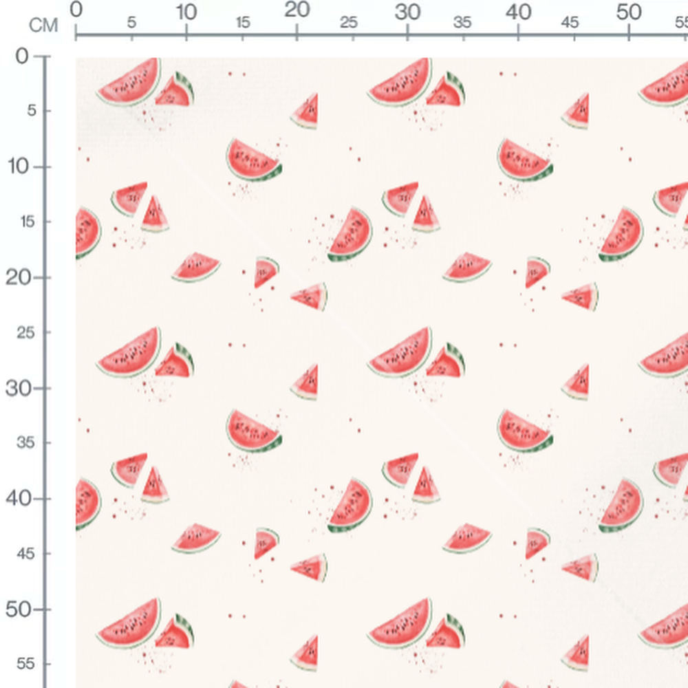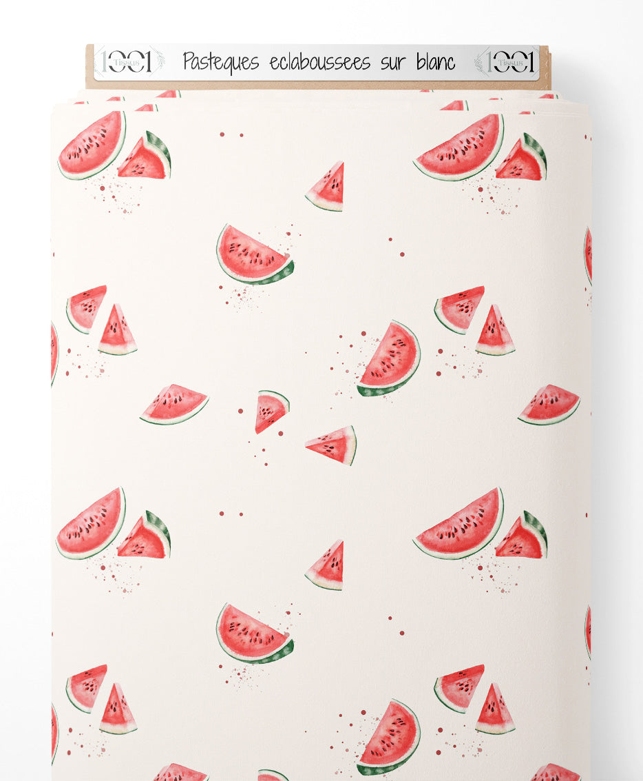 Les tranches de pastèque sont peintes dans des tons de rouge vif avec des écorces vertes. De petites éclaboussures rouges ajoutent un effet artistique autour des morceaux de fruit.Les tissus