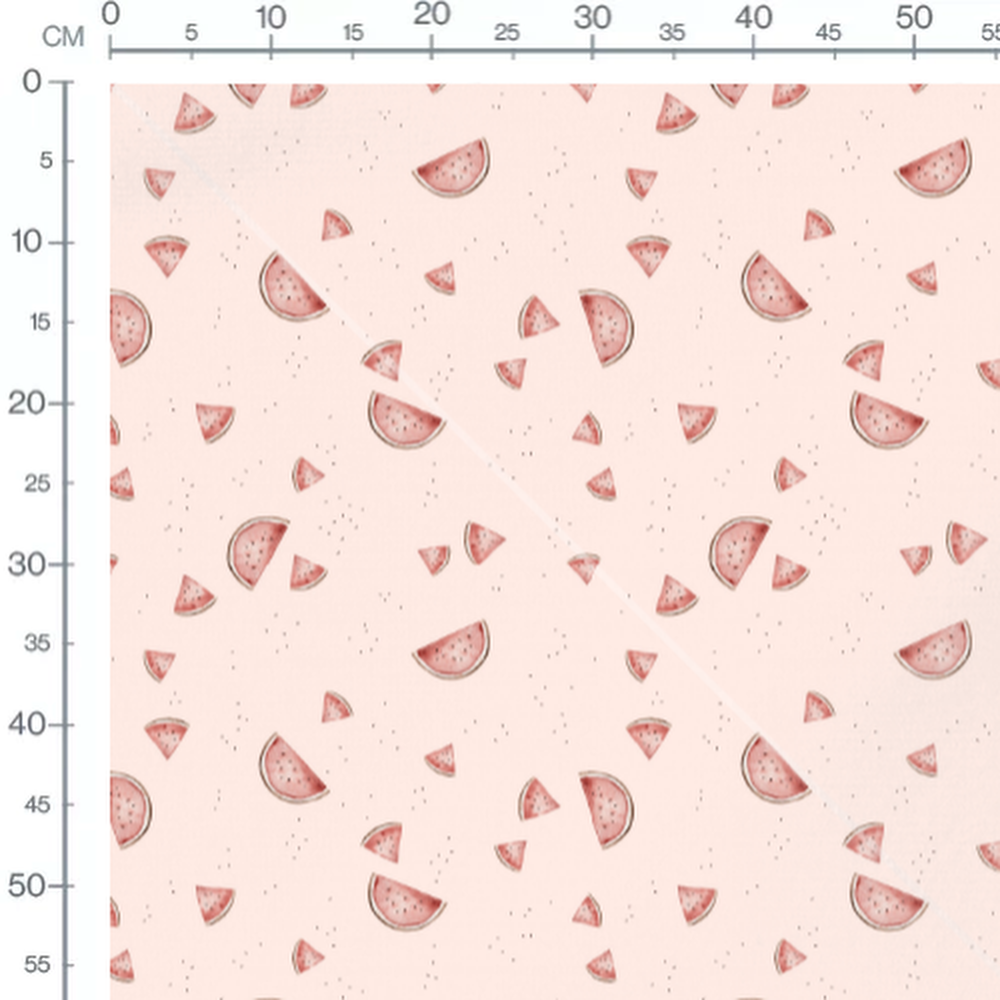 Les tranches de pastèque sont de différentes tailles. Les graines noires ajoutent un contraste subtil au motif.Les tissus