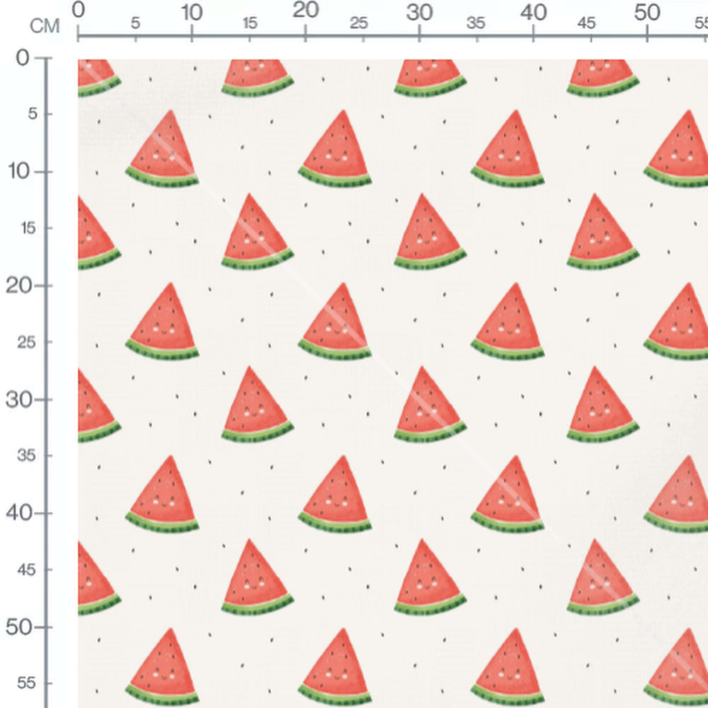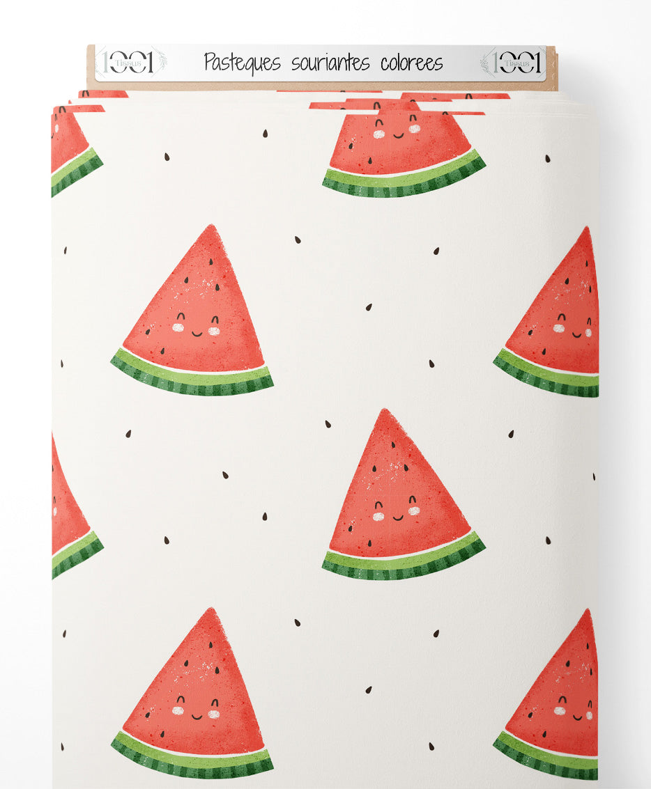 Les tranches de pastèque présentent des visages souriants et des joues roses. Une bordure verte et blanche entoure chaque tranche. Les graines noires ajoutent un contraste subtil sur le fond clair.Les tissus