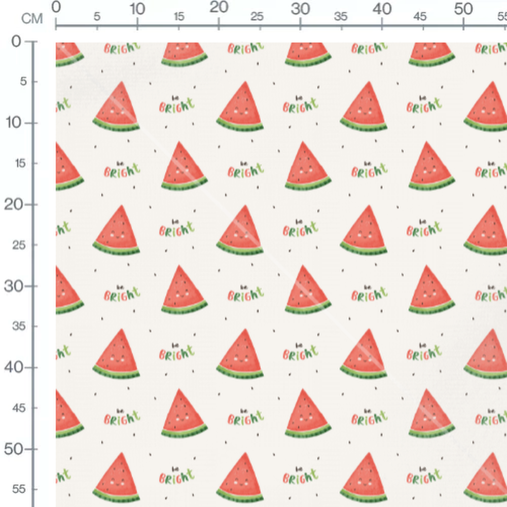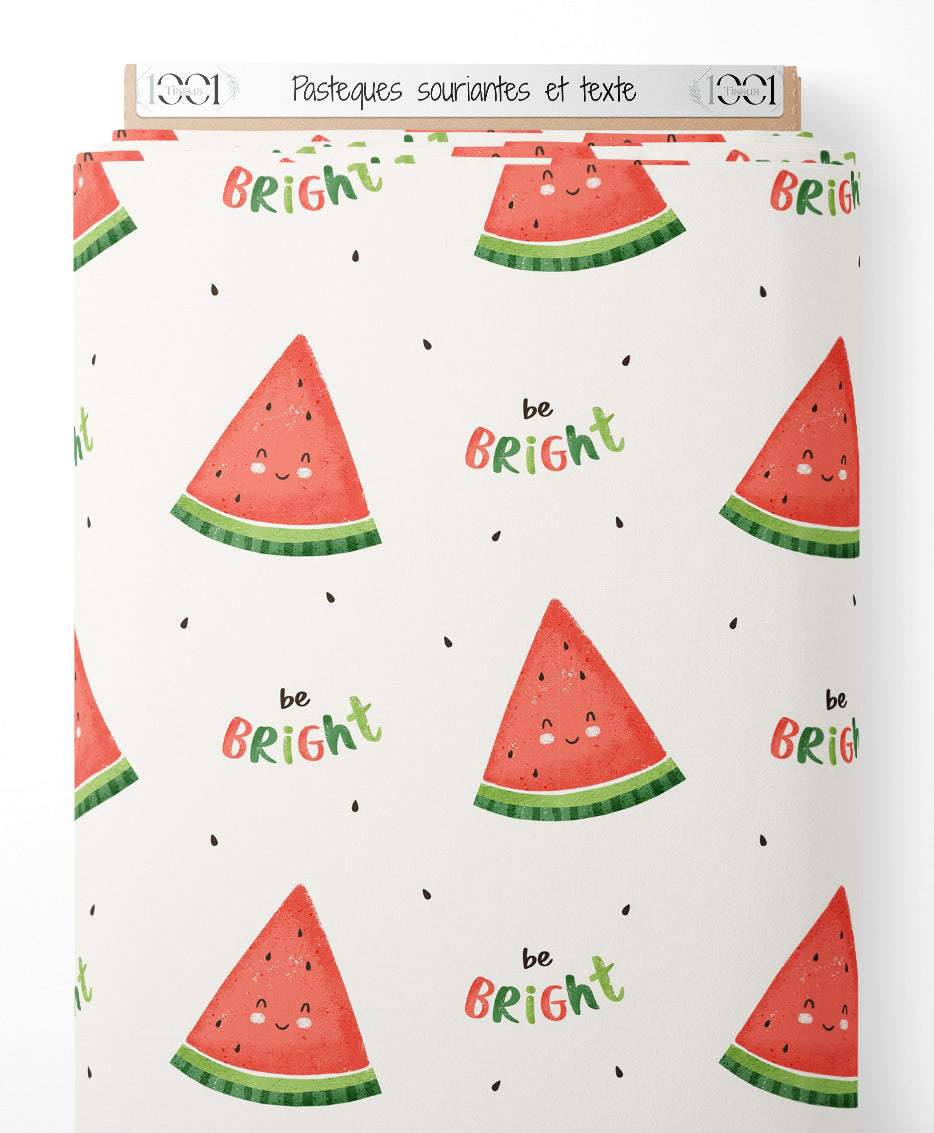 Les tranches de pastèque sont accompagnées de petites graines noires. Le texte 'be bright' est écrit en lettres vertes et rouges.Les tissus