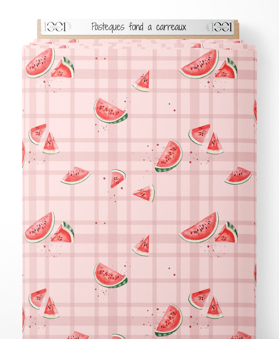 Les tranches de pastèque sont dispersées sur un fond à carreaux rose. Chaque tranche montre une chair rouge avec des graines noires. Les écorces sont vertes avec une bordure blanche.Les tissus