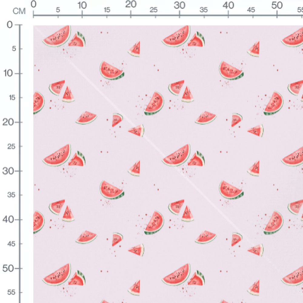 Les tranches de pastèque sont illustrées avec des détails réalistes. Le fond rose clair met en valeur les couleurs vives des fruits. Les éclaboussures ajoutent une touche artistique au motif.Les tissus