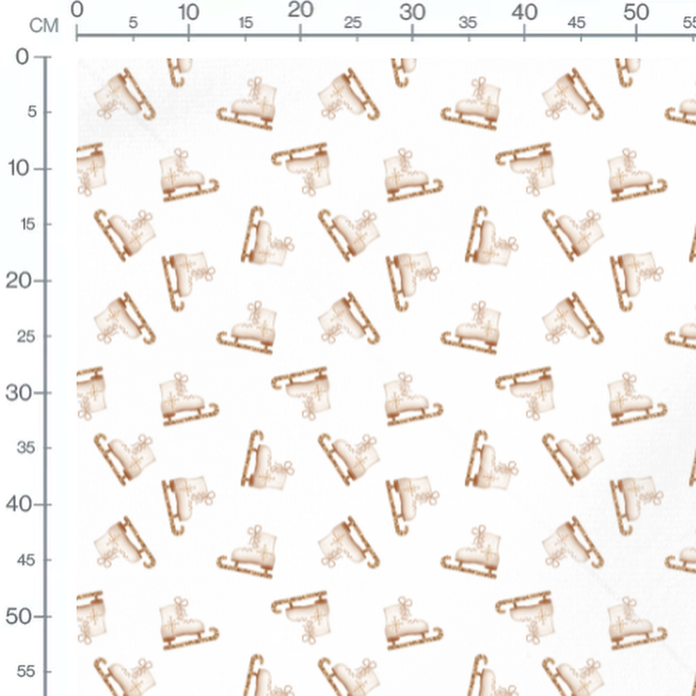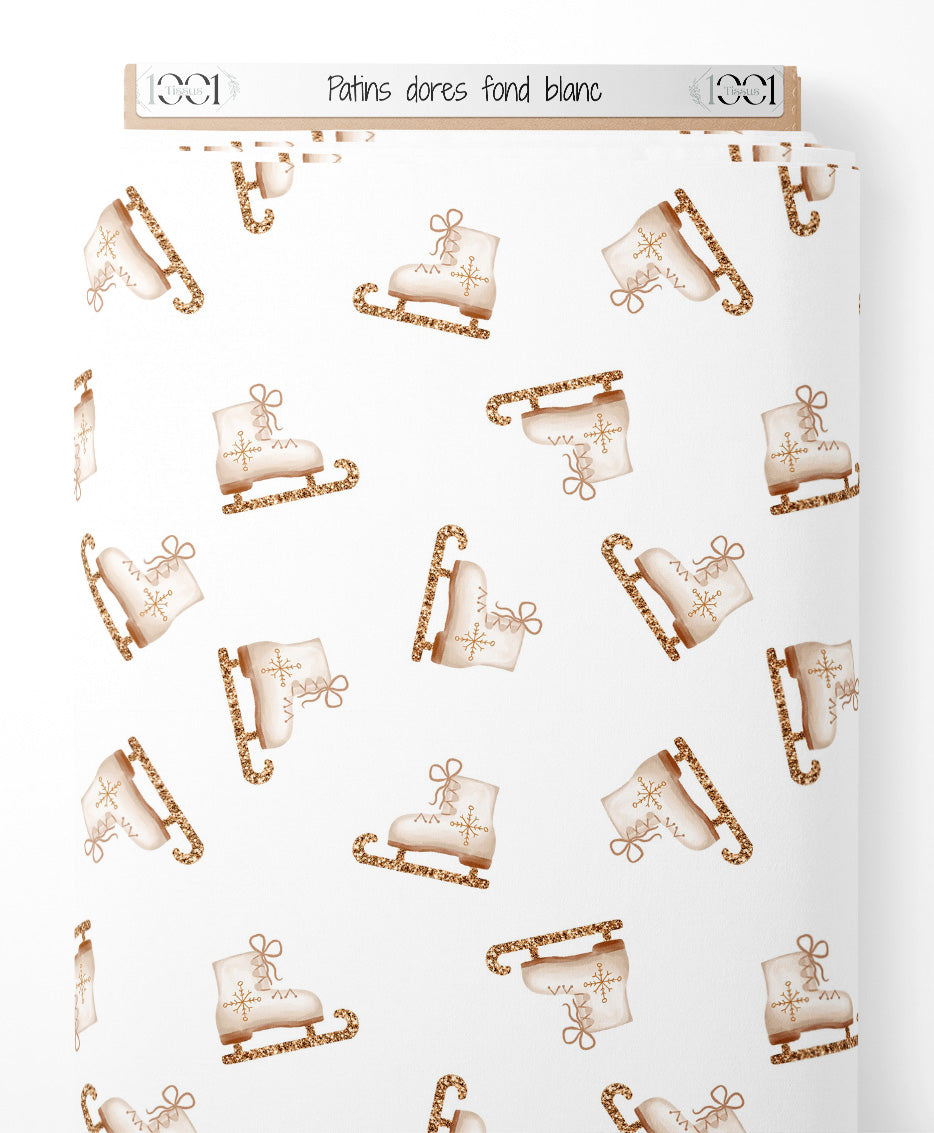 Les patins sont ornés de flocons de neige stylisés et de petits rubans dorés. Les lames des patins sont également dorées, ajoutant une touche festive. Le fond blanc met en valeur les détails dorés des motifs.Les tissus